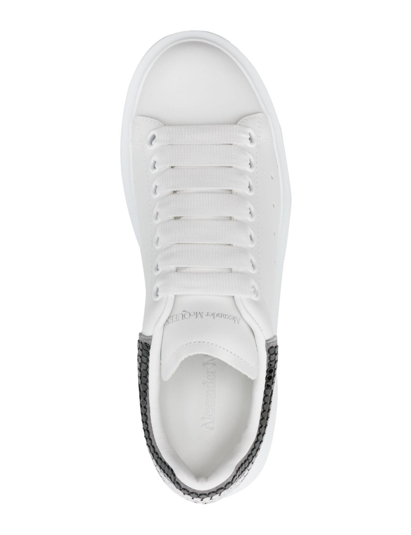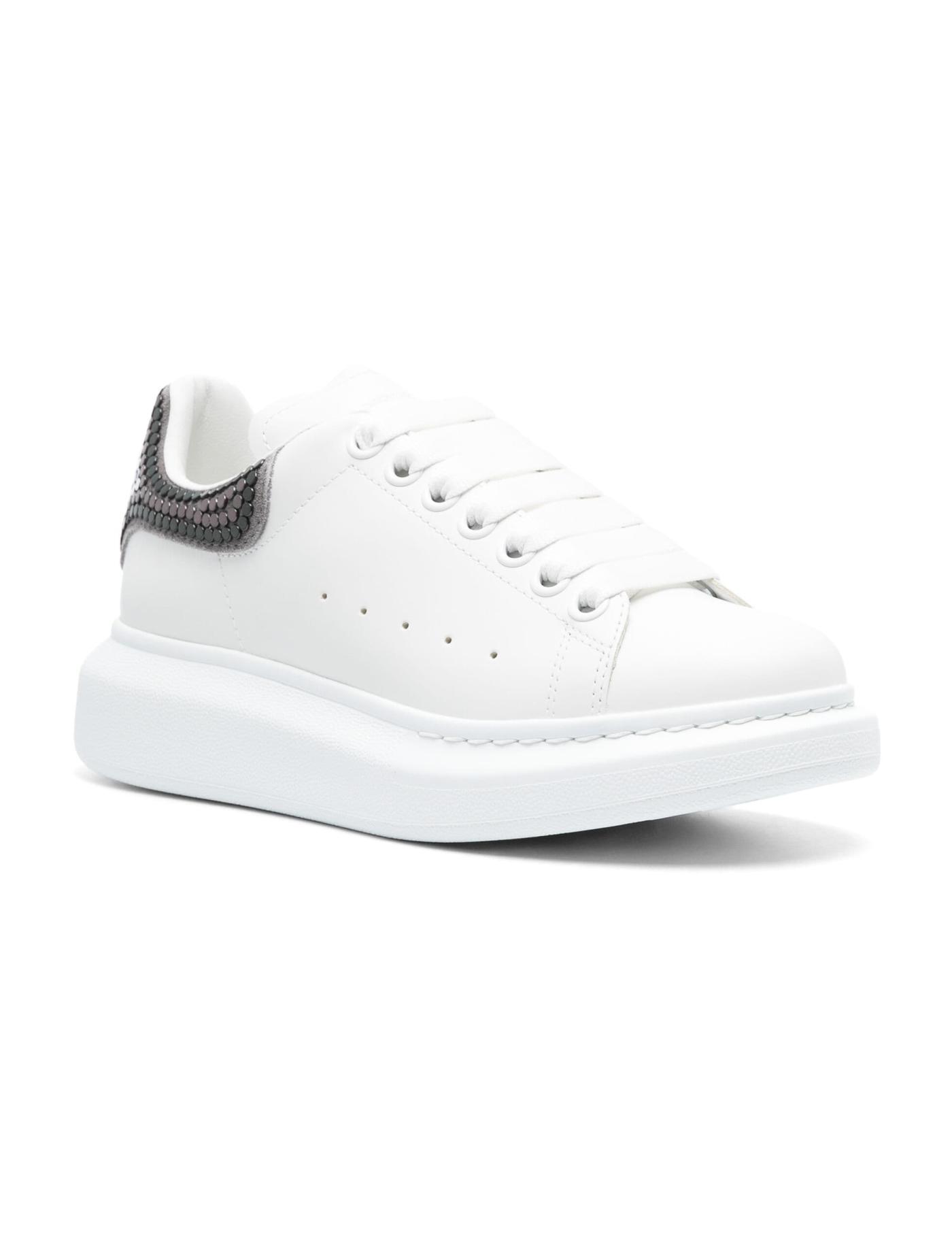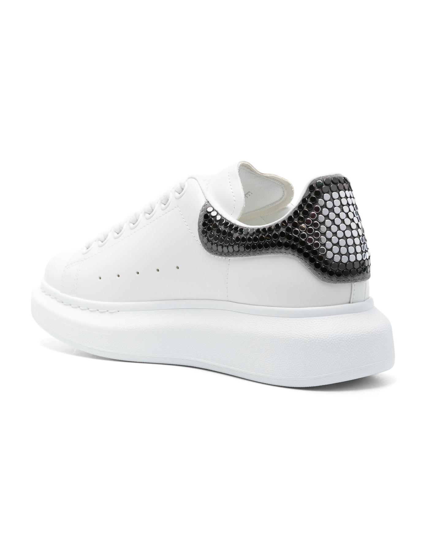 Alexander McQueen's Oversized sneaker family is distinguished by its heel panels and namesake rubber soles. This pair is crafted from white leather with a grey suede counter embellished with flat gunmetal and silver-tone studs.