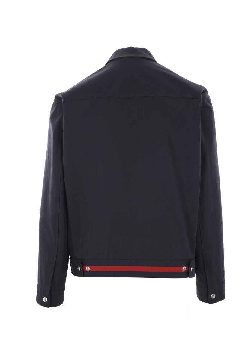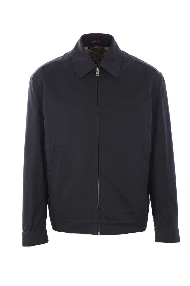 Gucci's jacket crafted in dark blue cotton twill with Gucci embossed detail at chest. It features shirt-style collar, zip closure, side welt pockets, long sleeves with buttoned cuffs and straight hem with back Web insert. Beige and blue GG fabric lining.