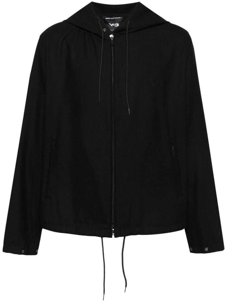 black recycled polyester blend flannel front two-way zip fastening drawstring hood long sleeves logo print at the chest drawstring hem