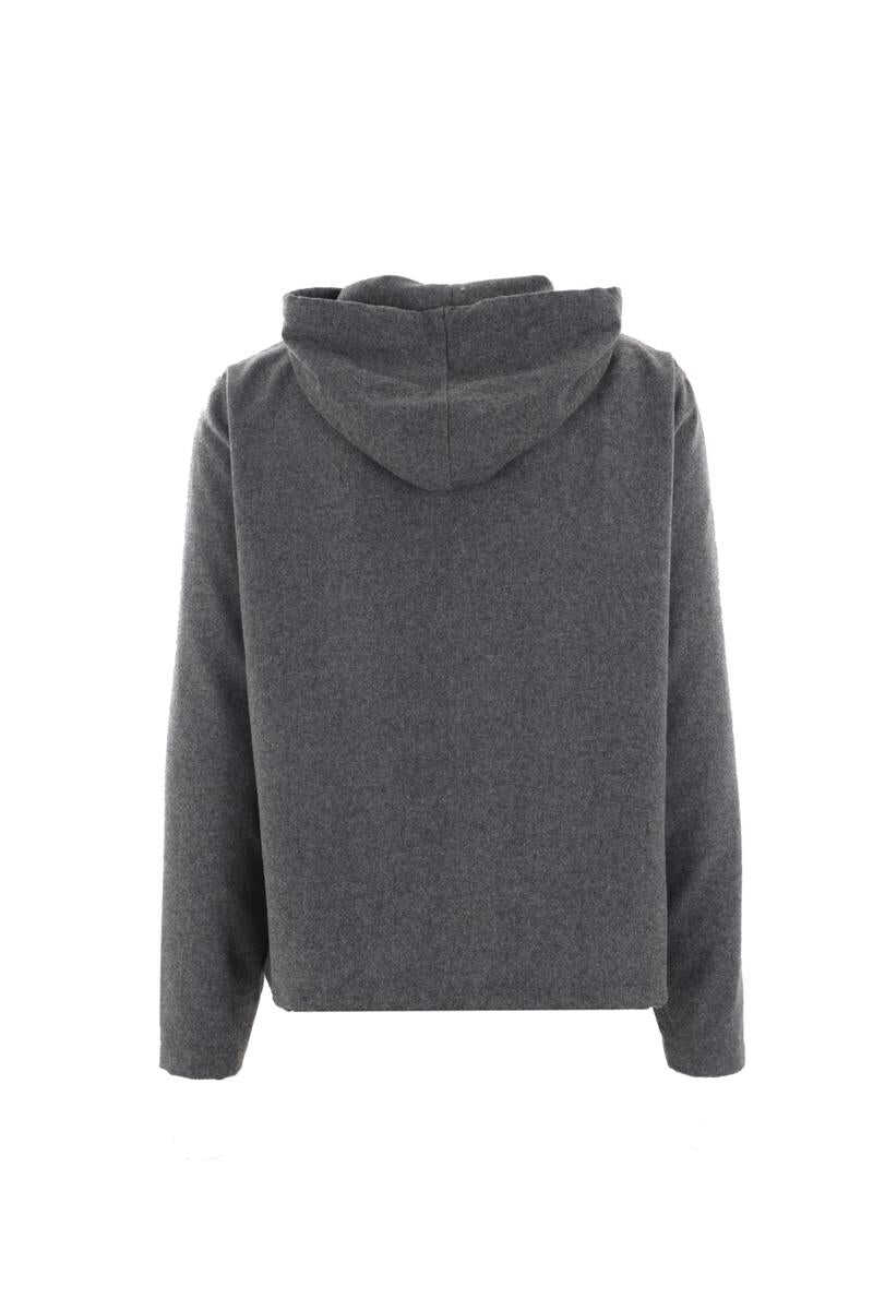 Y-3's hoodie crafted in grey wool blend flannel with logo print at chest. It features double-slider zip closure, side pockets, long sleeves with buttoned cuffs and drawstring at hem.