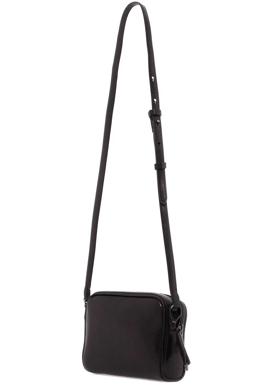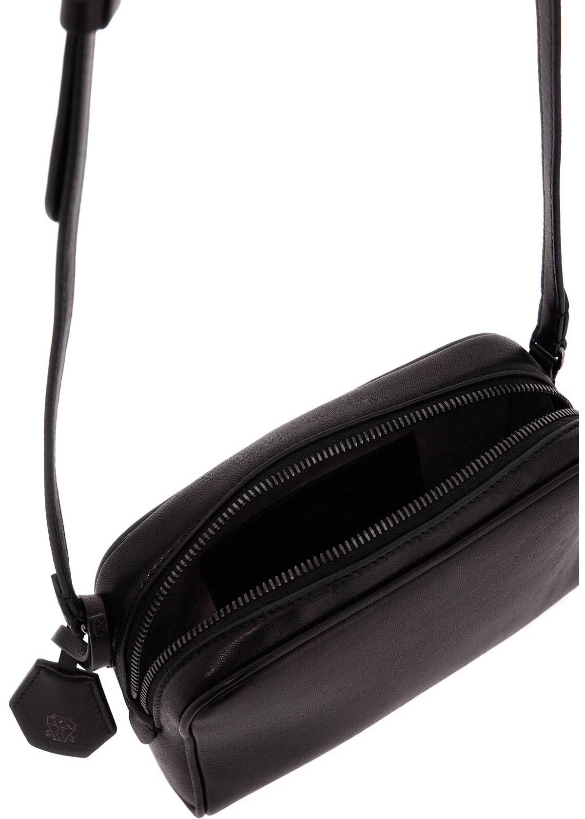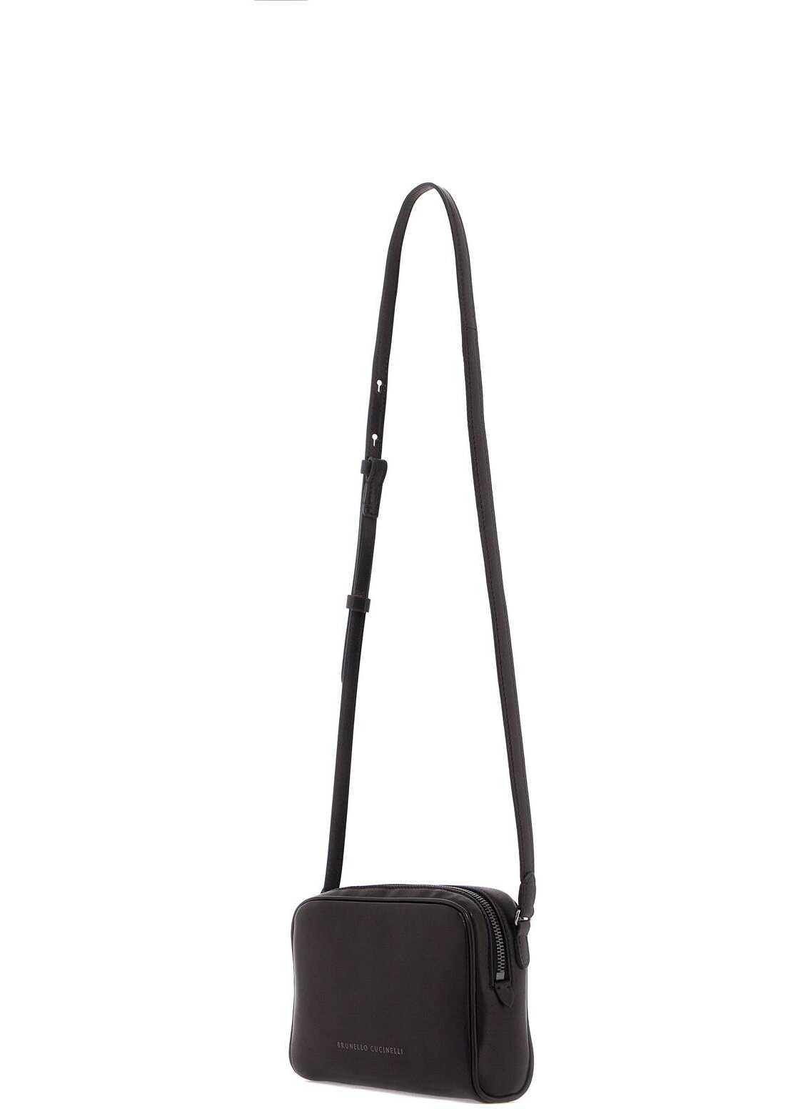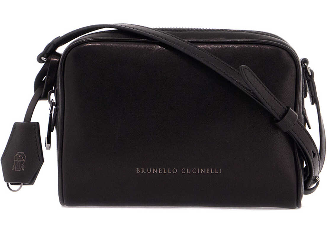The Brunello Cucinelli Boston mini shoulder bag is made of Wet Effect nappa leather, featuring a fine grain with a slightly glossy finish. It has a zip closure on the top, a suede-lined interior with a credit card slot, and an adjustable shoulder strap. The design is completed with a laminated lettering logo on the front and a keychain with a branded leather case. The metallic accessories are Nickel-free with a ruthenium finish.