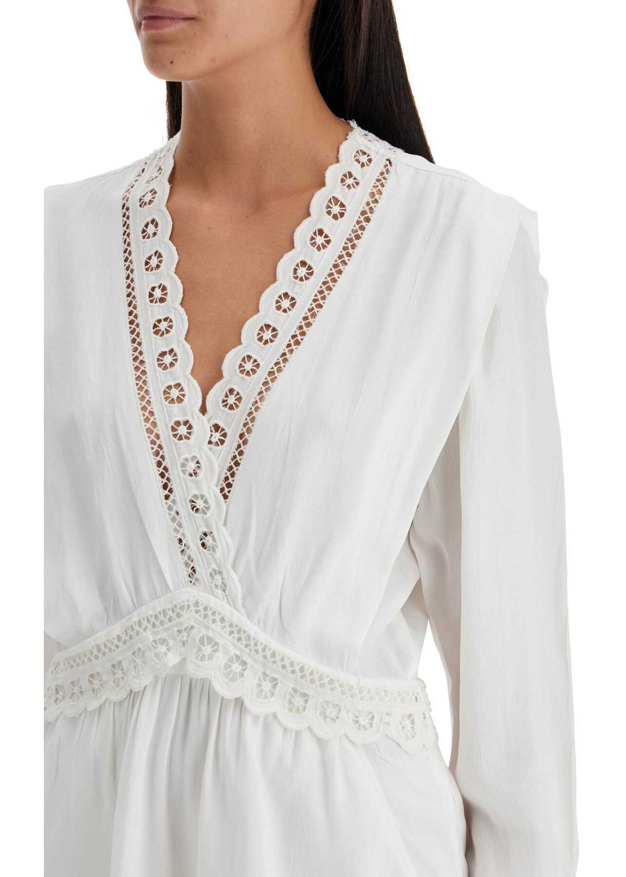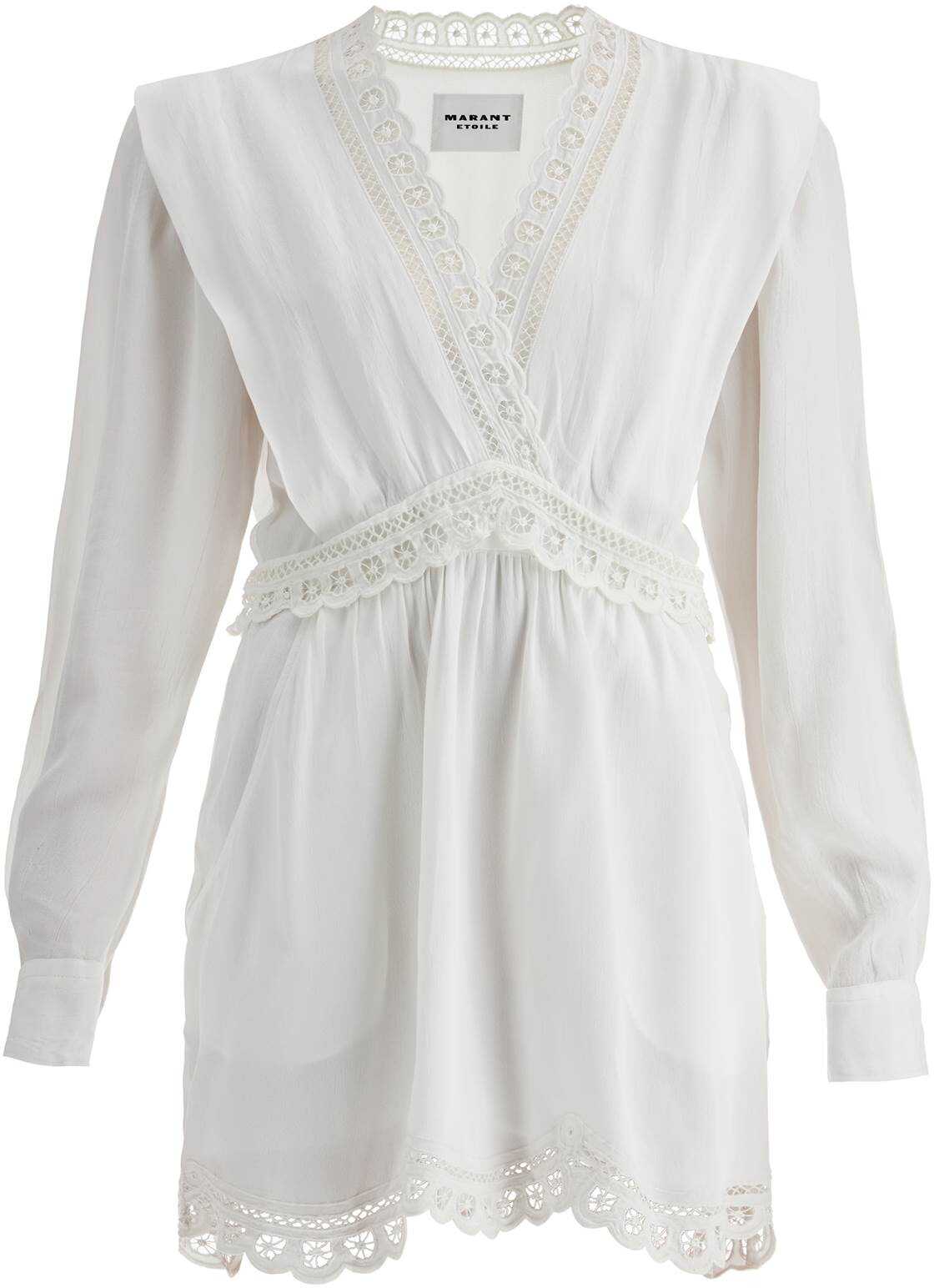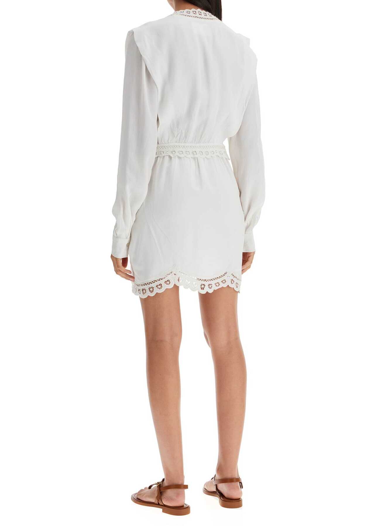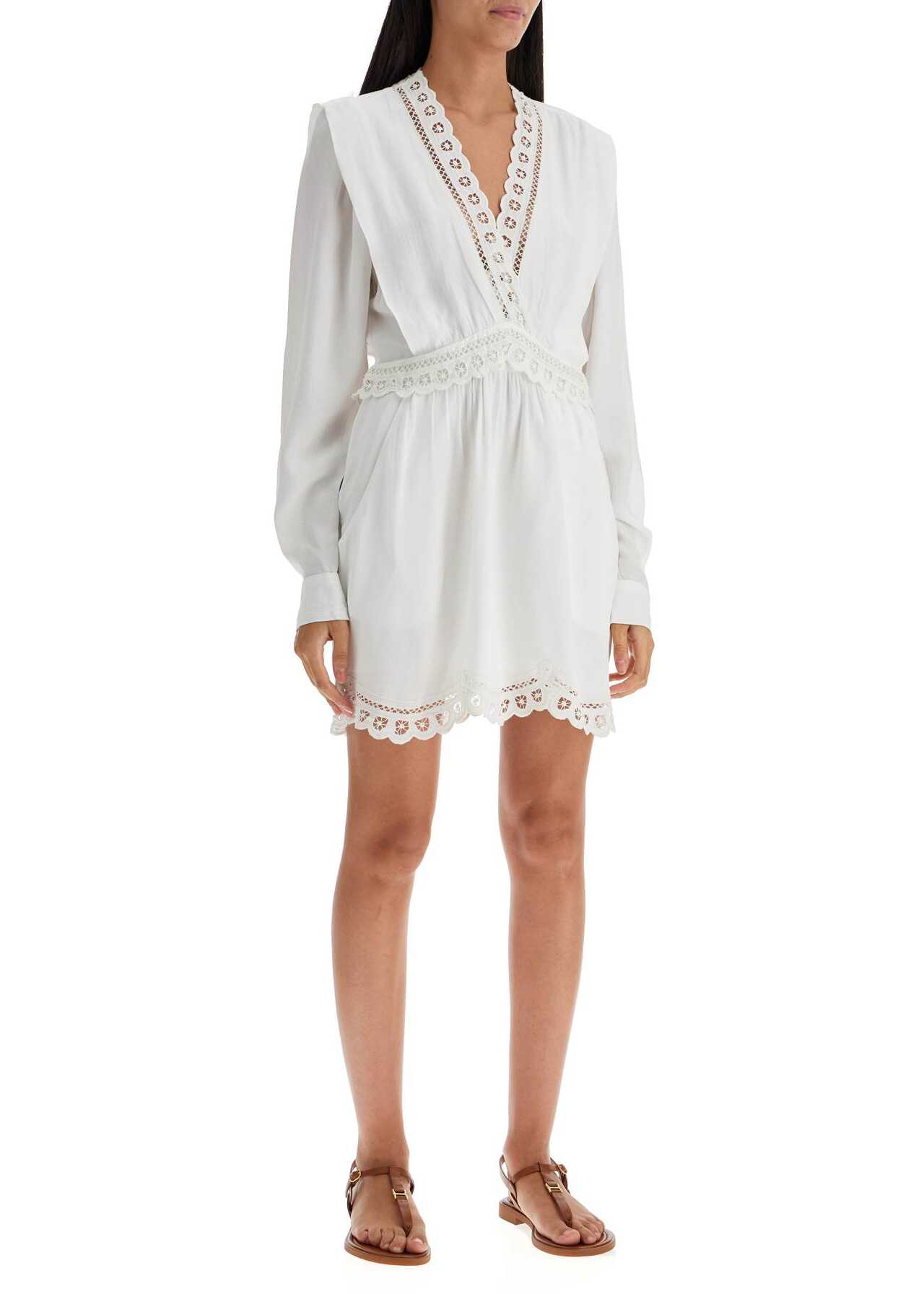 The Felie mini dress by Marant Etoile is made of viscose crêpe and features delicate Sangallo lace details on the V-neckline, hem, and waist. It has a hidden zip closure with small snaps, side pockets, and a flared cut with an asymmetrical hem. The model is 177 cm tall and wears size [insert size here].