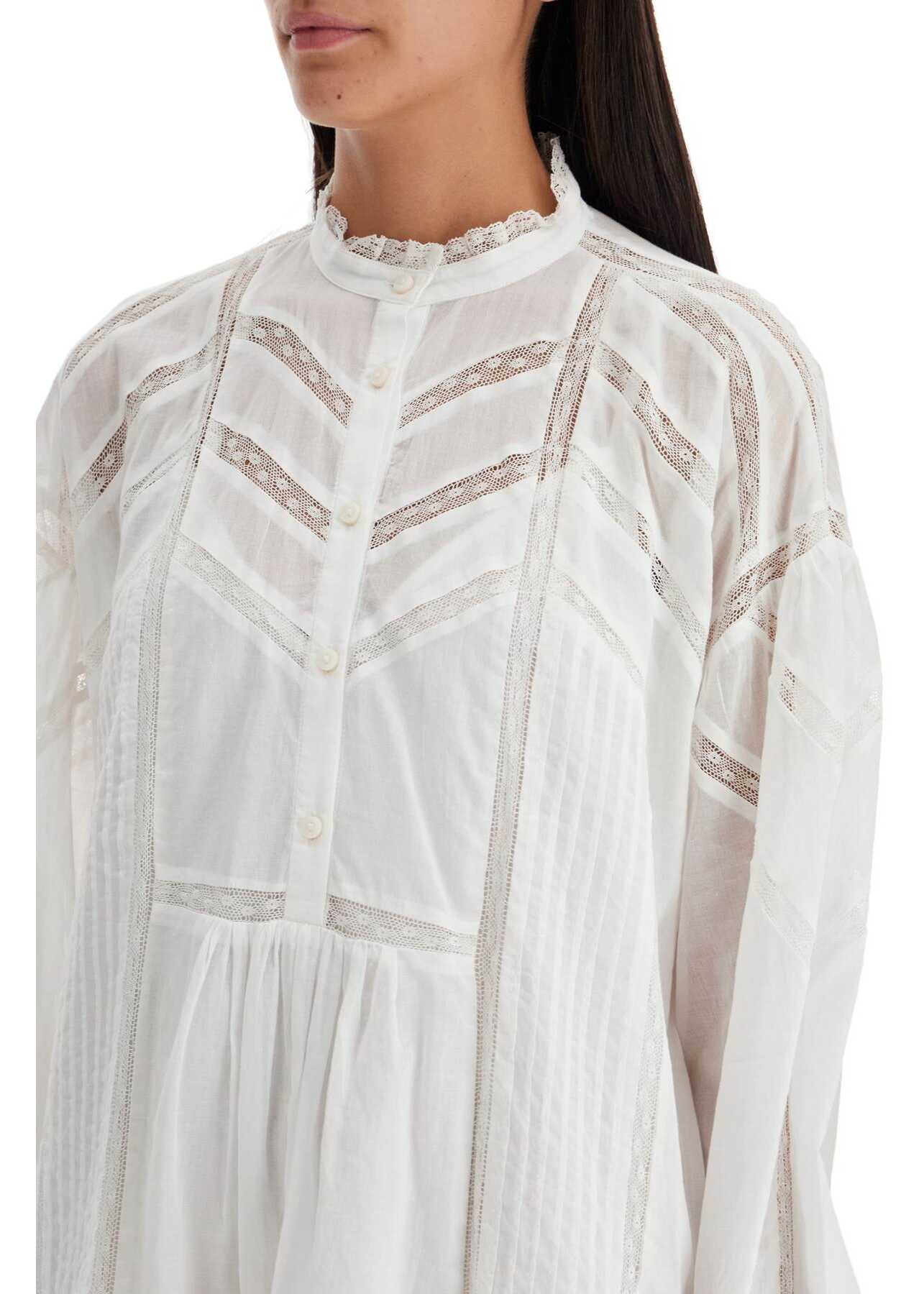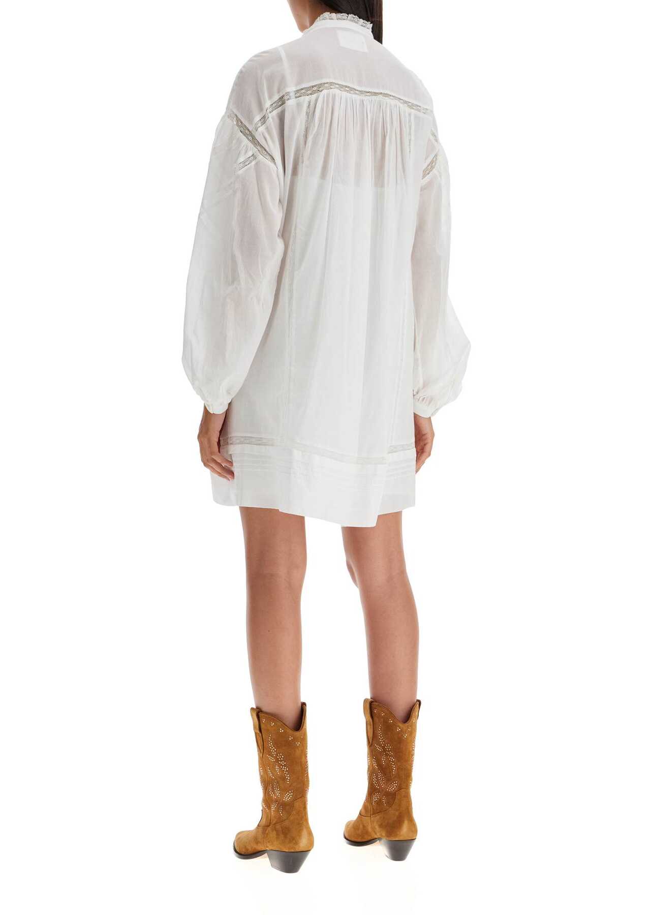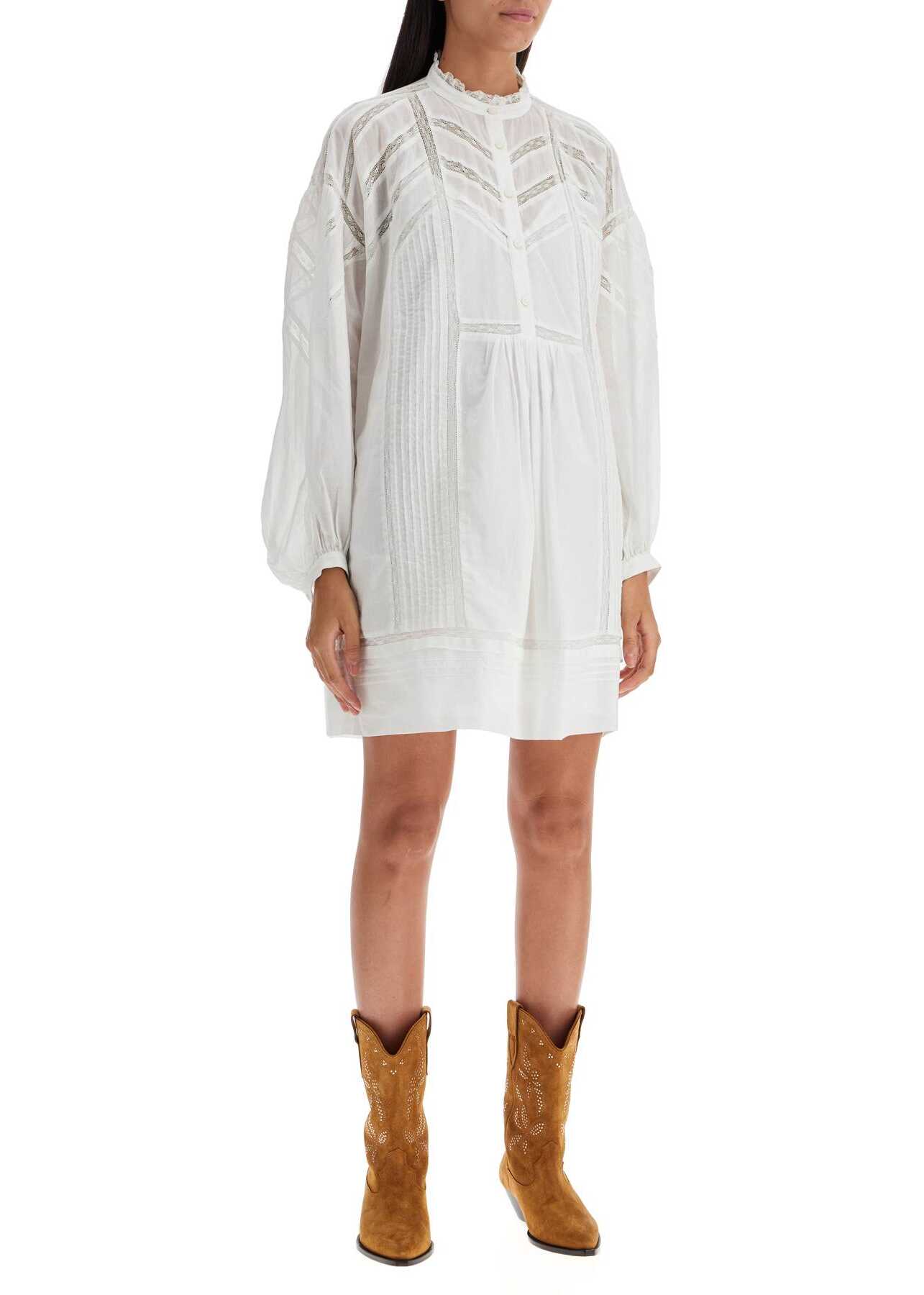 The Galia mini dress by Marant Etoile is made of cotton voile and lace, featuring a mandarin collar and front button closure. It has pleated details and a loose fit. The model is 177 cm tall and wears size FR 36.