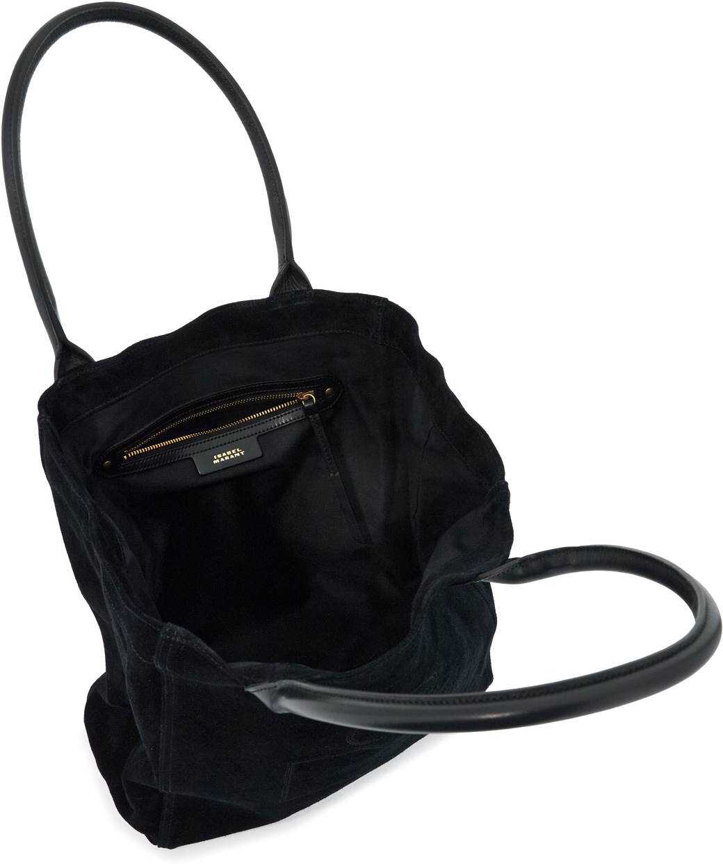 The small Yenky tote bag by Isabel Marant is made of suede leather with an engraved and embroidered logo on the front. Its deconstructed design features double tubular leather handles and a fabric-lined interior with a zip pocket.