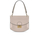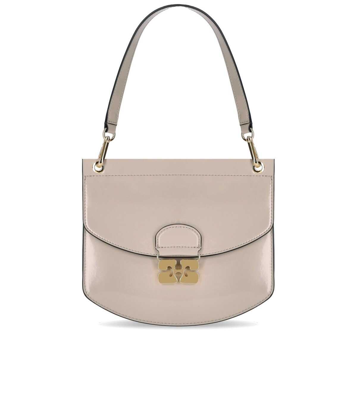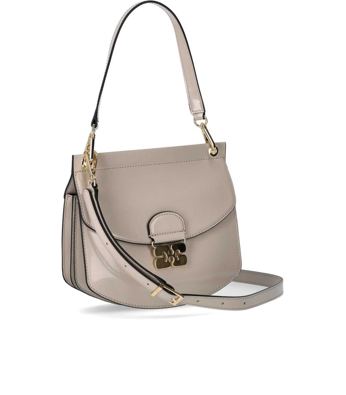 Ganni bag made of faux leather in shades of gray, with a glossy finish. Lined interior, magnetic closure with gold logo detail, interior divided into three compartments, one of which has a zipper. Adjustable and removable shoulder strap, dimensions 22.5x21x8 cm.