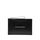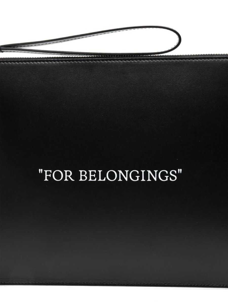 Black calf leather smooth grain signature quote motif debossed logo to the rear top zip fastening wrist strap main compartment internal card slots full lining