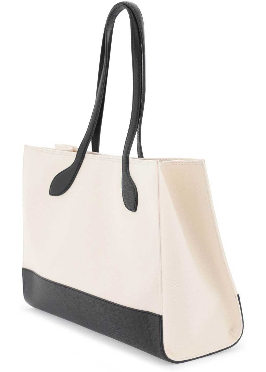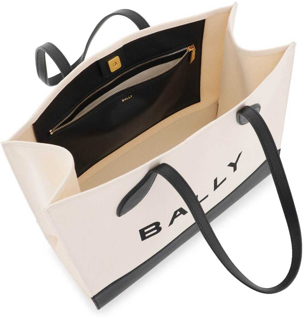 Bally tote bag crafted in cotton-blend canvas. Leather double handle and base, magnetic closure, fabric interior with one zippered pocket and gold-finished metalware.