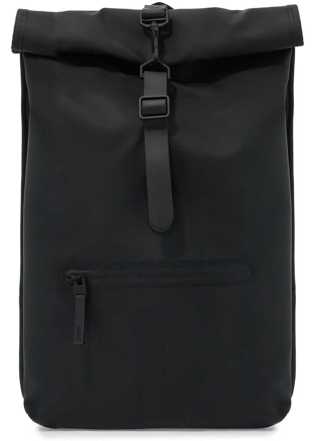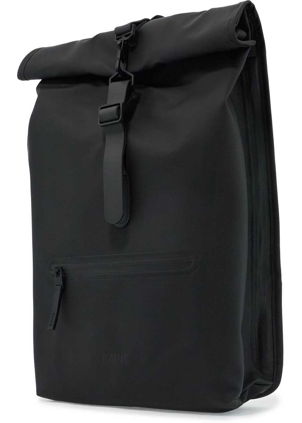 Rolltop Rucksack by RAINS in technical waterproof fabric featuring a rolltop closure with iconic lobster clasp. Canvas-lined main compartment, one front zippered pocket and a side pocket for laptop (16 in). Adjustable padded shoulder strap, padded mesh back and top handle. Tone-on-tone metalware.