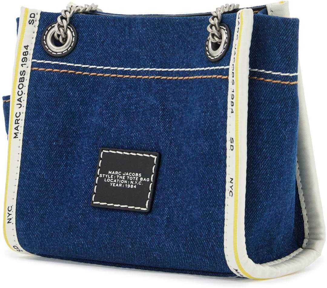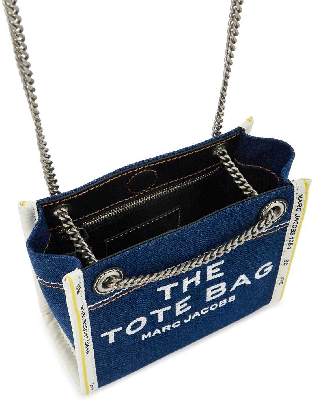 The Denim Chain Crossbody Tote Bag by Marc Jacobs is made of structured denim in pure cotton with a dark wash. It is adorned with an embroidered brand logo on the front, contrast fabric trims and double stitching. It features a magnetic closure, a denim-lined interior with smooth leather details and a zip pocket, a side handle and a convertible double sliding chain handle that can be worn as a shoulder strap. The metal accessories have a matte silver finish.