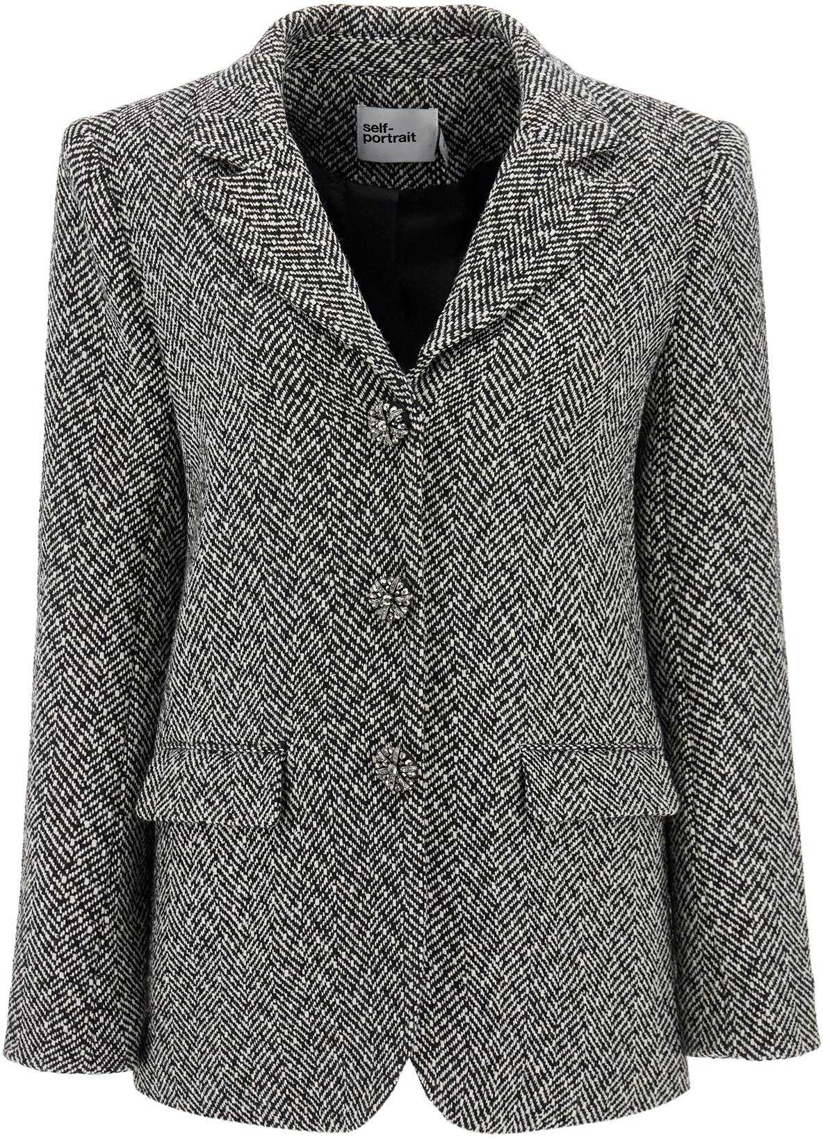 This single-breasted blazer by Self-Portrait is made of a wool blend with a houndstooth pattern and features three jewel buttons for closure. It has a notched collar, two flap pockets, and a central slit at the back. The interior is lined with lightly padded shoulders. The model is 177 cm tall and wears a UK size 6.