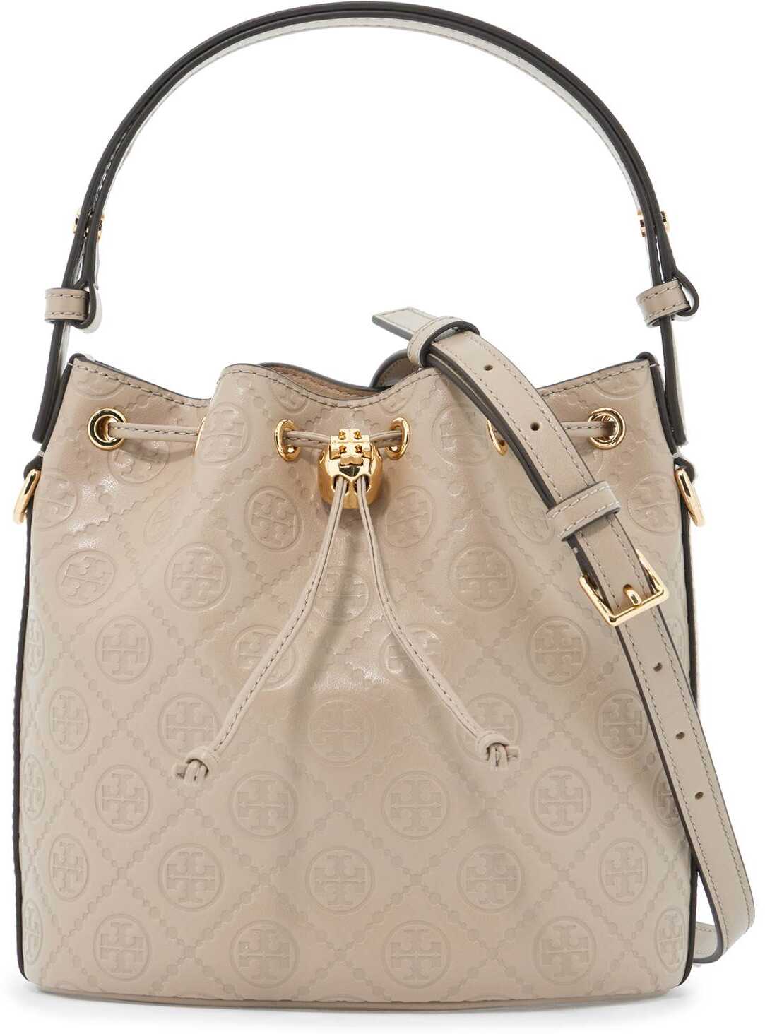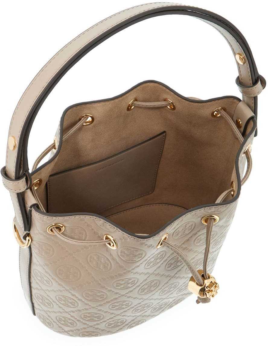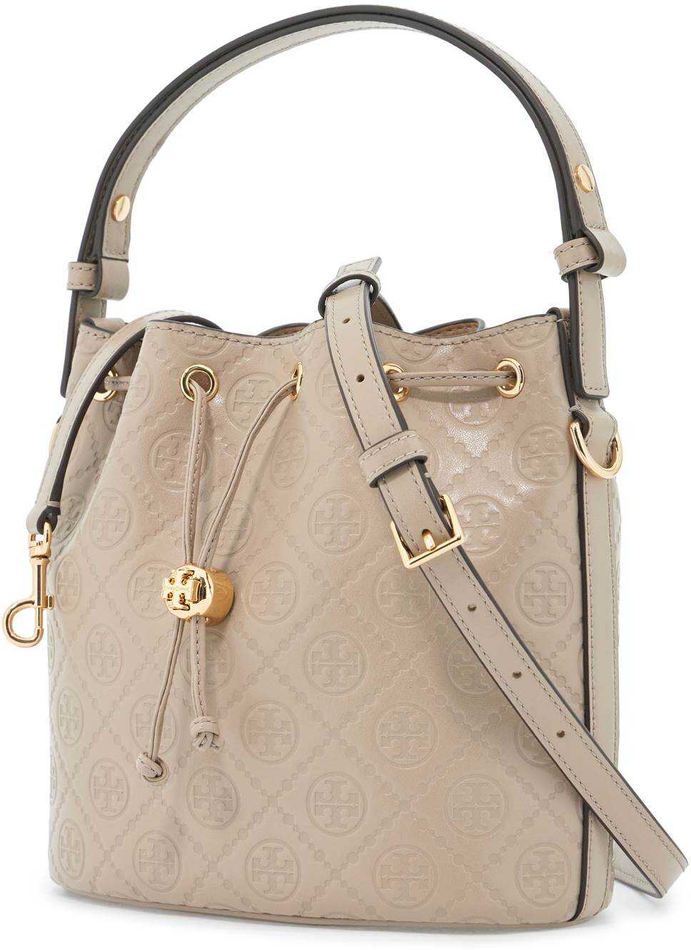 This Tory Burch bucket bag is made of glossy leather with the iconic T Monogram motif printed all over. It features an adjustable handle and a removable, adjustable shoulder strap, as well as a drawstring closure with a branded spring lock. The interior is lined with suede and has a flat pocket. The hardware is in golden brass.