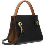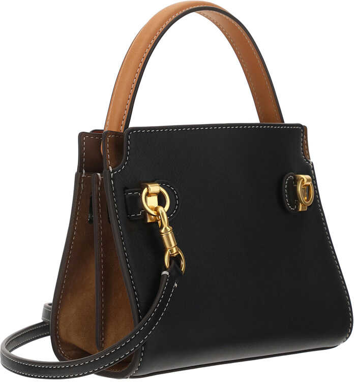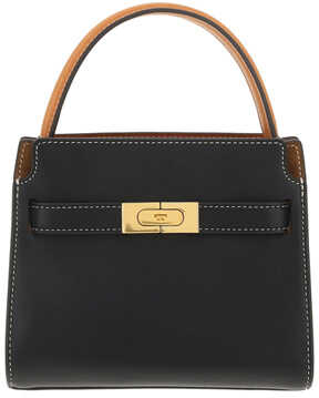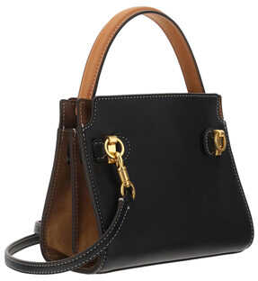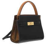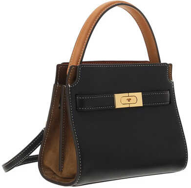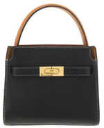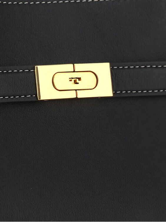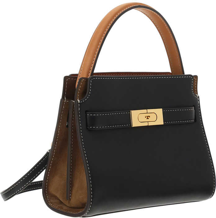 Calfskin Lee Radziwill Pebbled Bag by Tory Burch, suede trim, automatic opening on the front with iconic brand monogram, removable and adjustable shoulder strap, removable and adjustable leather shoulder strap, single rigid leather handle. five interior compartments including one with zipper for closure.