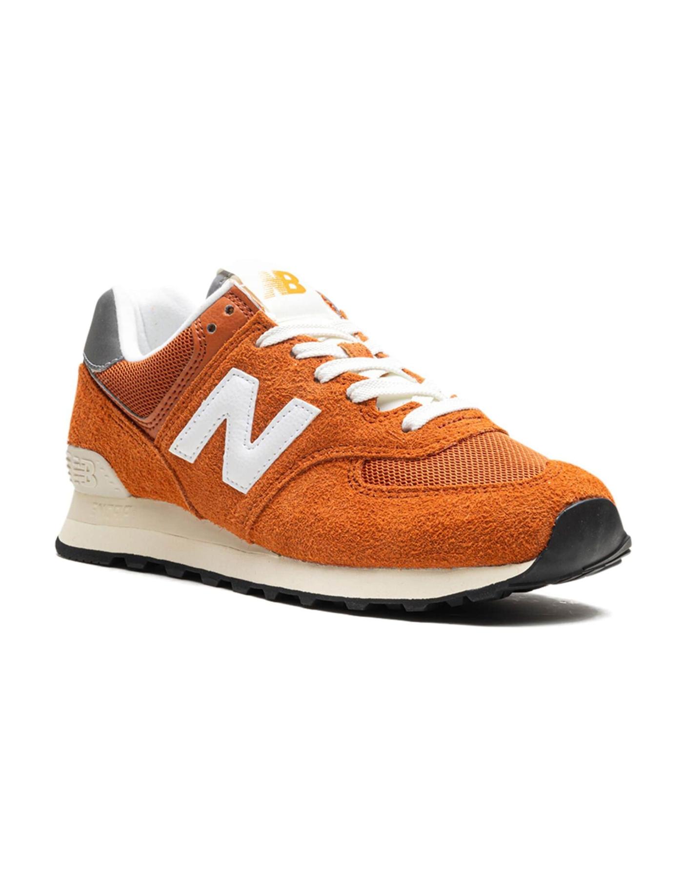 New Balance’s 574 sneaker debuted as a hybrid road and trail model and re-defined footwear design with its wider last and narrower silhouette. This burnt-orange pair is panelled from brushed suede and mesh with complementary grey heel counters and cream soles.