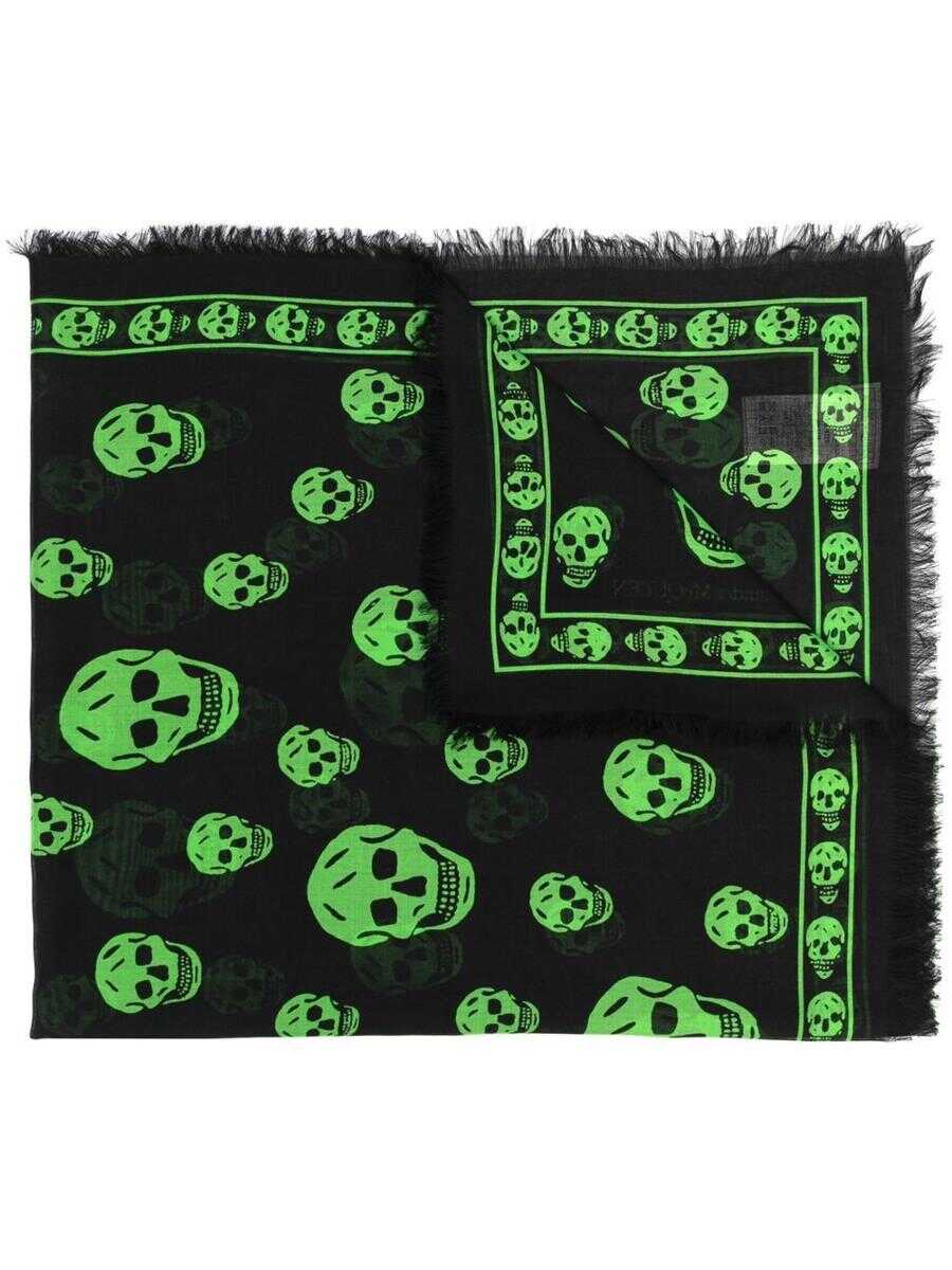 skull-print frayed scarf from Alexander McQueen featuring black/green, fine knit, intarsia knit, skull print, frayed edge, straight hem and modal-silk blend. Conscious: This item contains at least 50% low-impact materials, which are certified or widely recognised as having a lower environmental impact..