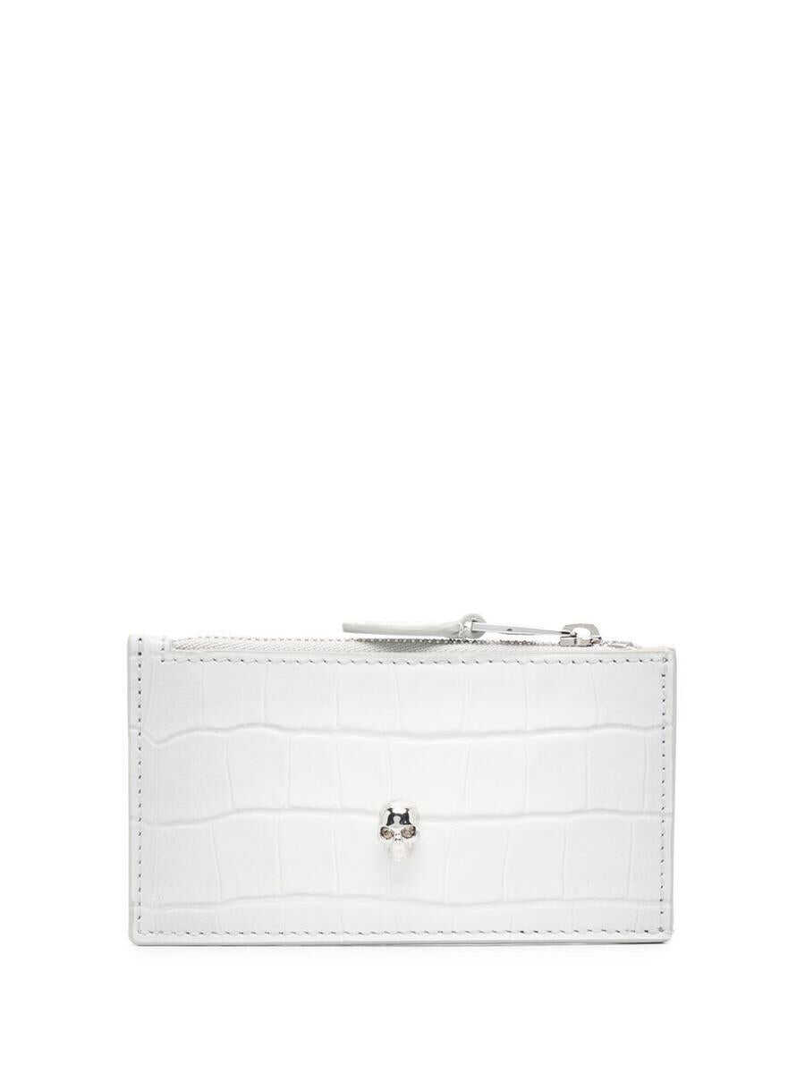 croc-effect calf leather purse from Alexander McQueen featuring white, calf leather, crocodile-effect embossed leather strap, silver-tone hardware, silver-tone logo lettering, logo plaque, top zip fastening and main compartment.