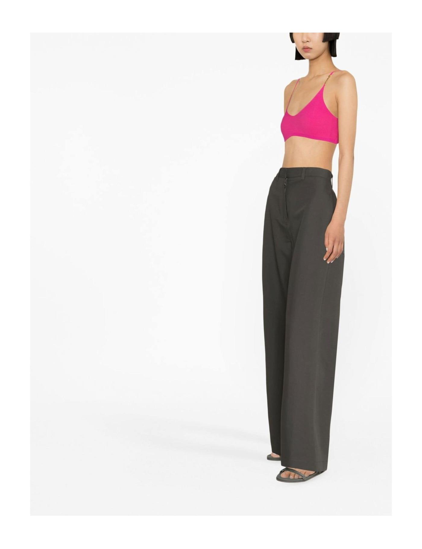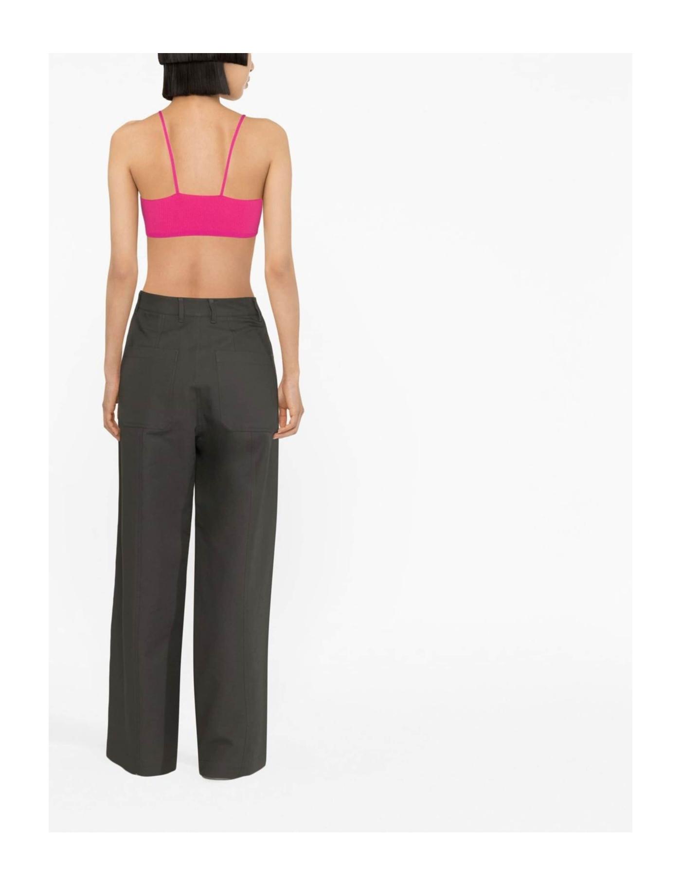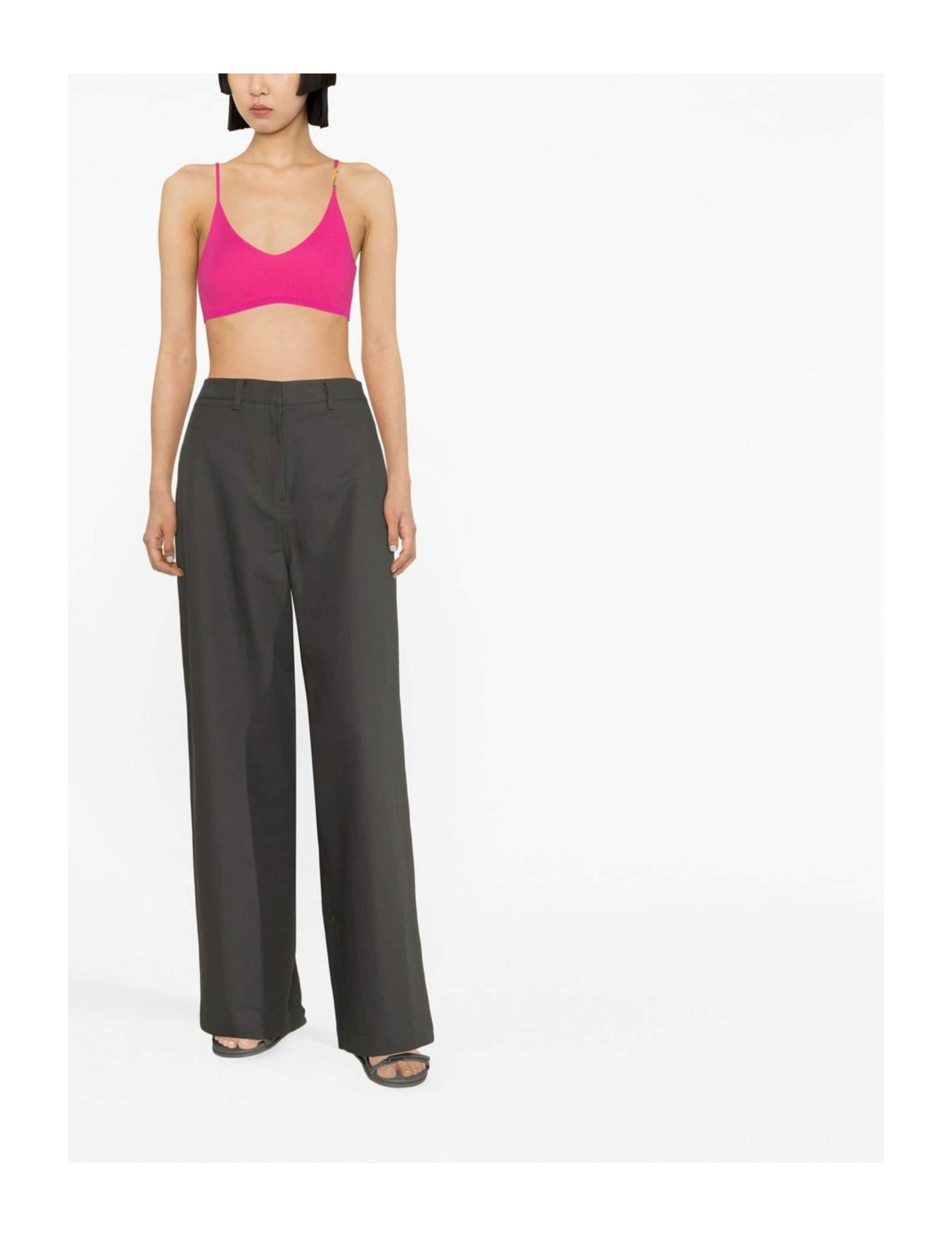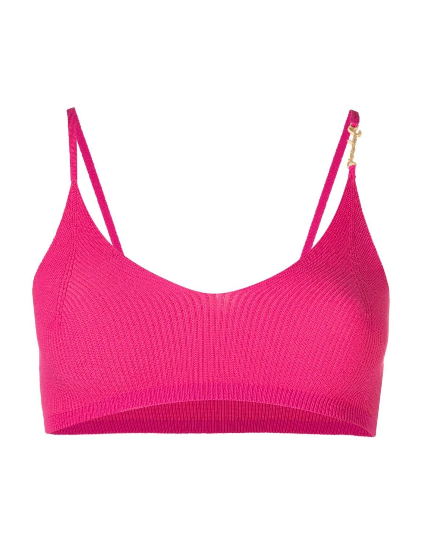 - Pralu logo-plaque crop top from Jacquemus featuring hot pink, knitted construction, V-neck, cropped and spaghetti straps.