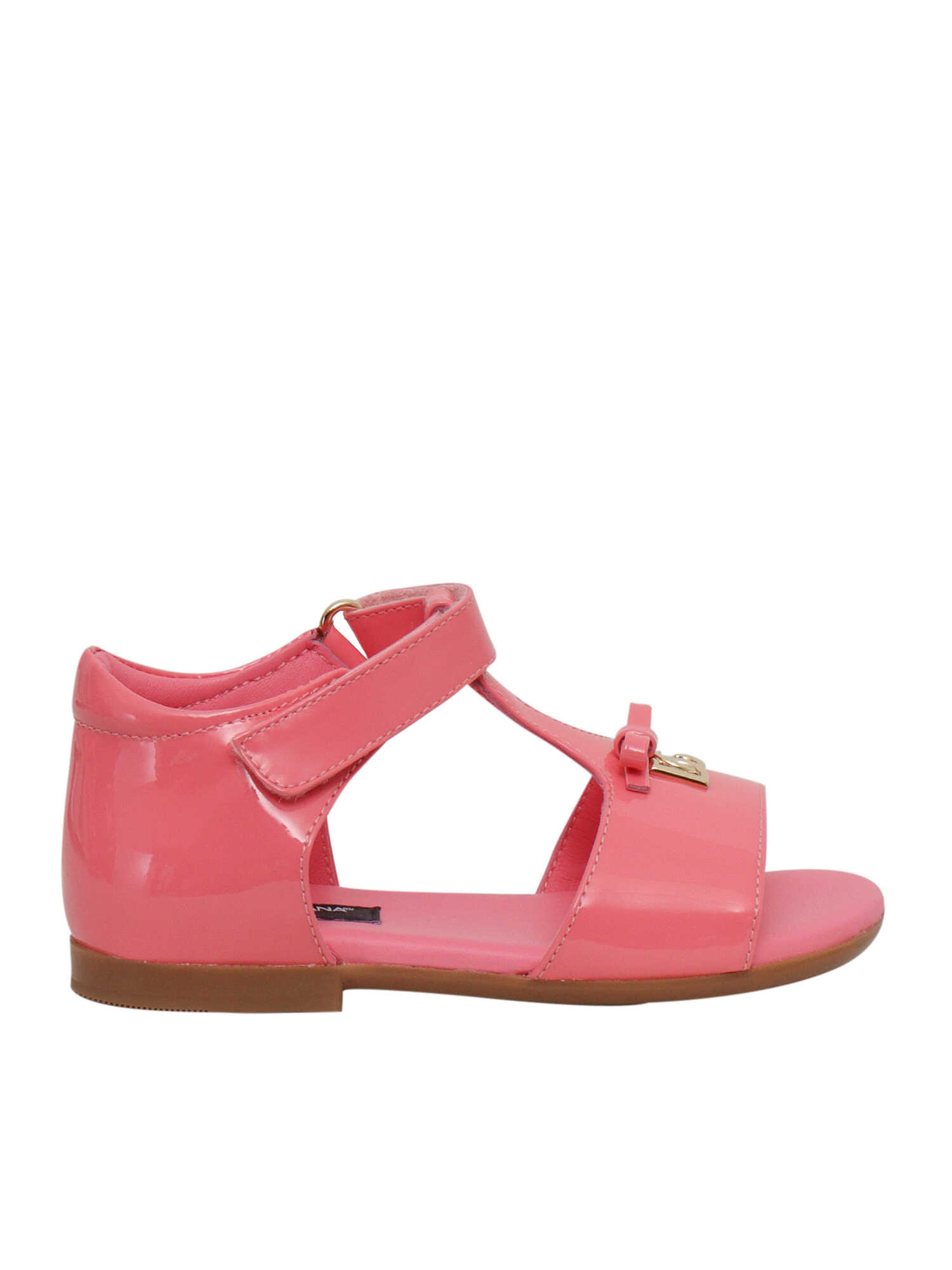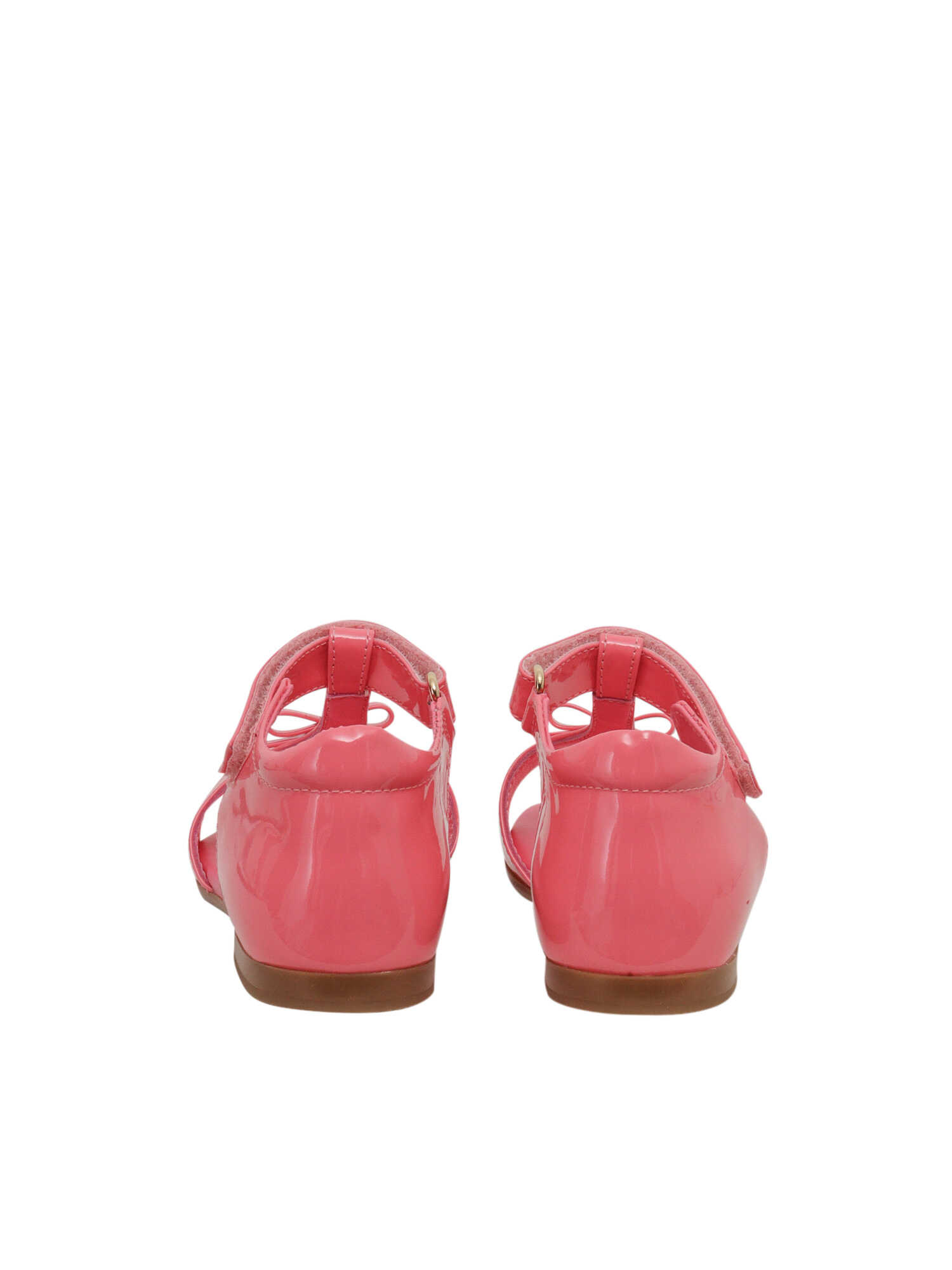 D&G pink patent leather sandal with gold detail on the band and tear on the ankle.