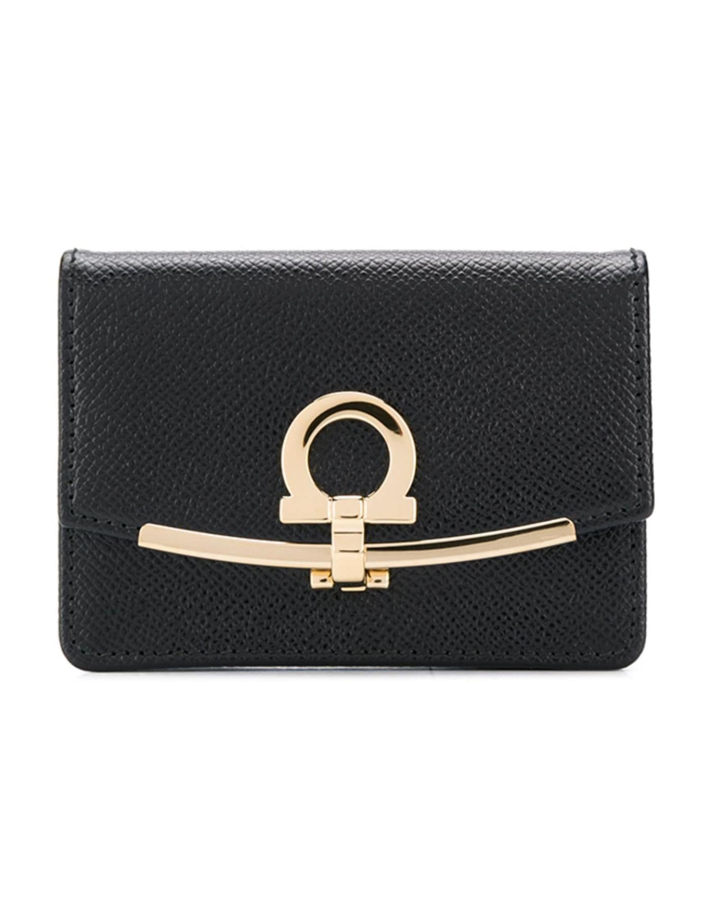 - Small but mighty, this wallet from Ferragamo seriously packs a stylish punch. Crafted from sumptuous black leather, its compact design lends itself to perfectly fitting inside most handbags. Keep your essentials entrapped in luxury. Featuring a foldover top, multiple interior compartments, gold-tone hardware, a signature Gancini clasp closure and a chain and ring detail.