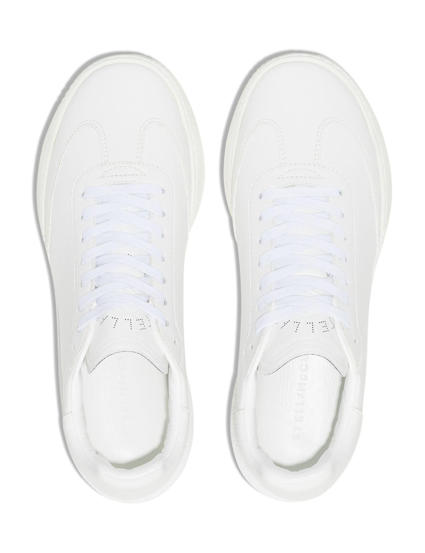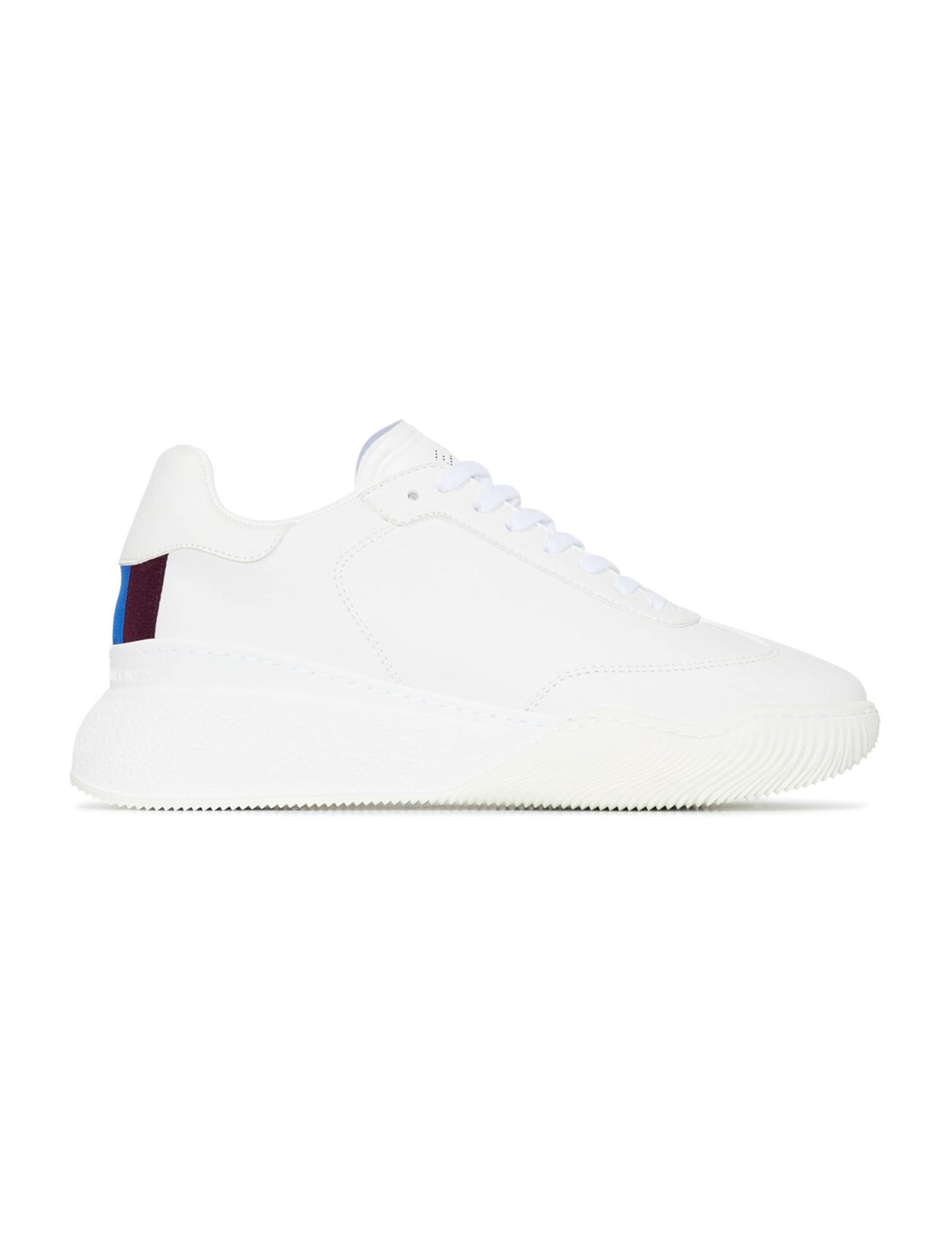 These white Stella McCartney Loop lace-up chunky sneakers are crafted in Italy from a combination of cotton, rubber and Alter Mat, an alternative to animal leather. They have a round toe, lace-up fastening, perforated logo tongue and raised rubber logo at the rear. They're finished with a contrast black and blue woven stripe detail at the heel and a thick rubber sole.