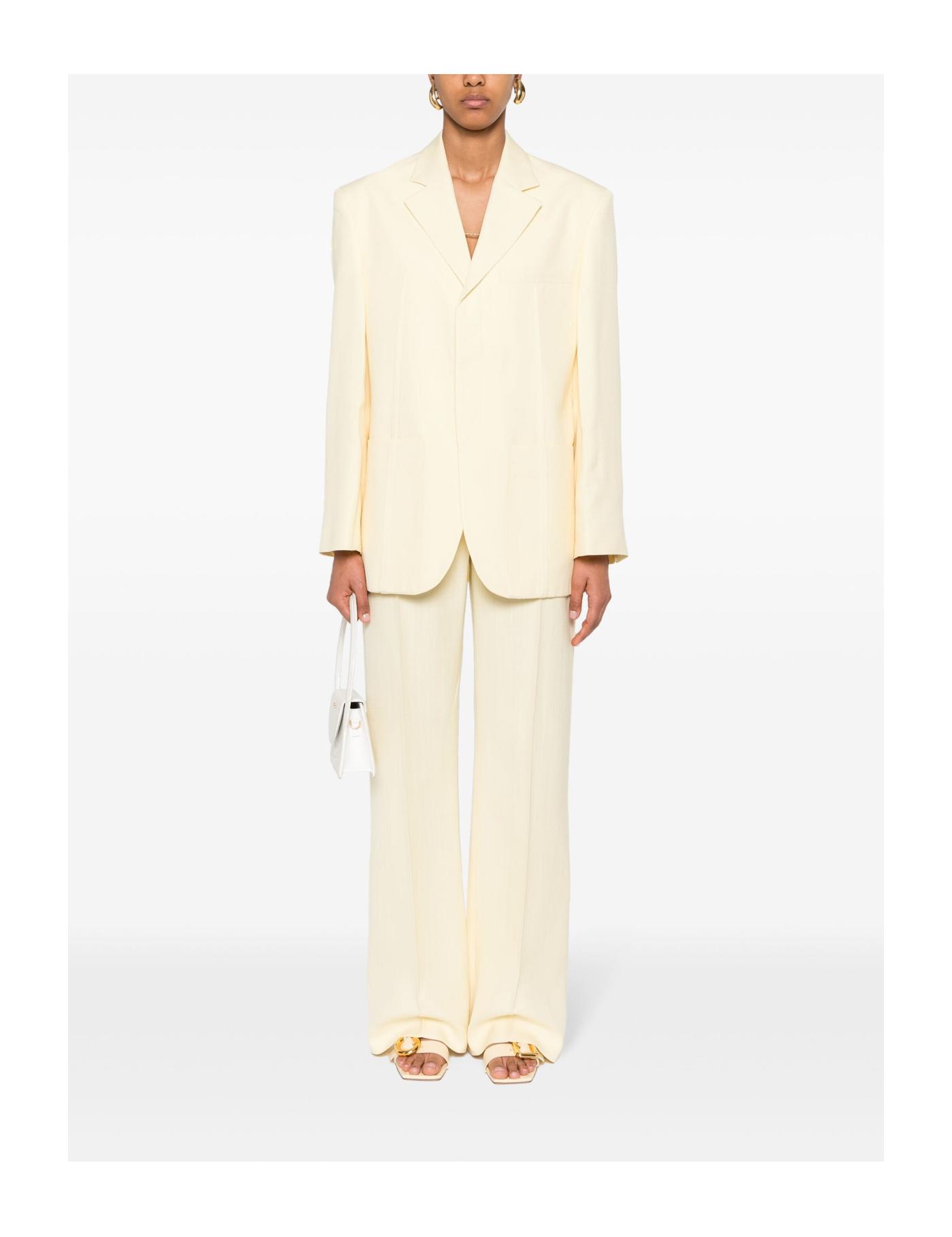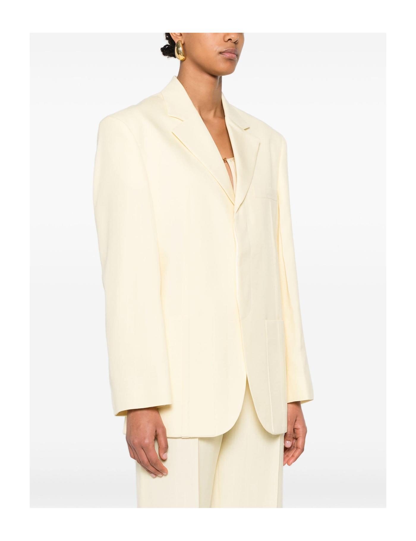 Jacquemus remains dedicated to bringing their twist to typical tailoring, and this blazer is a prime example. Inspired and designed with a bulkier silhouette in mind, this garment has an oversized shape and pleat detailing towards the front.