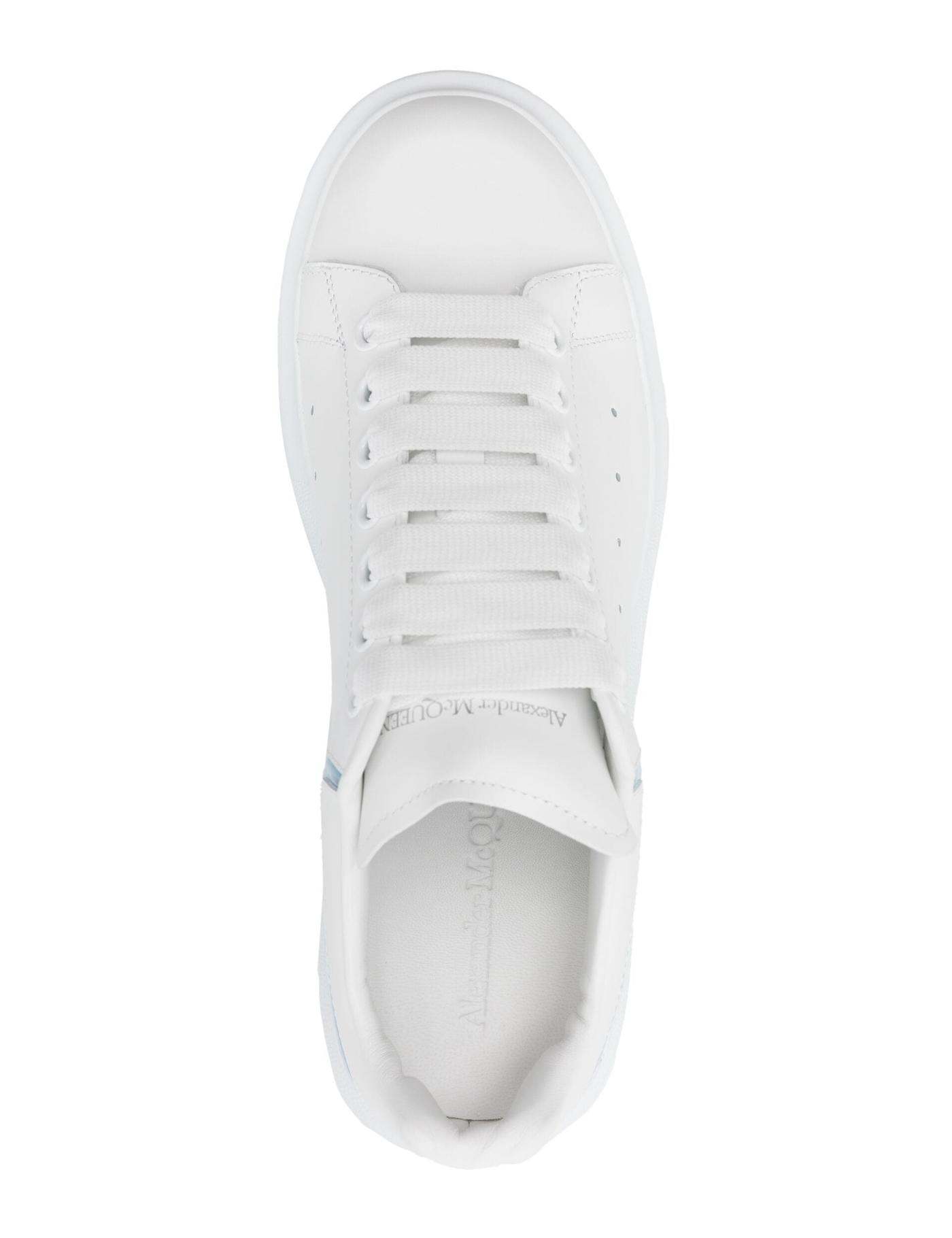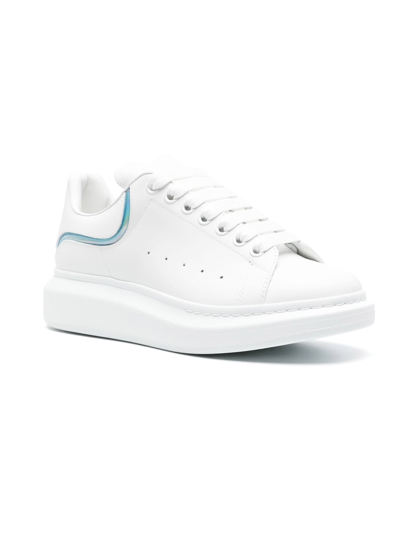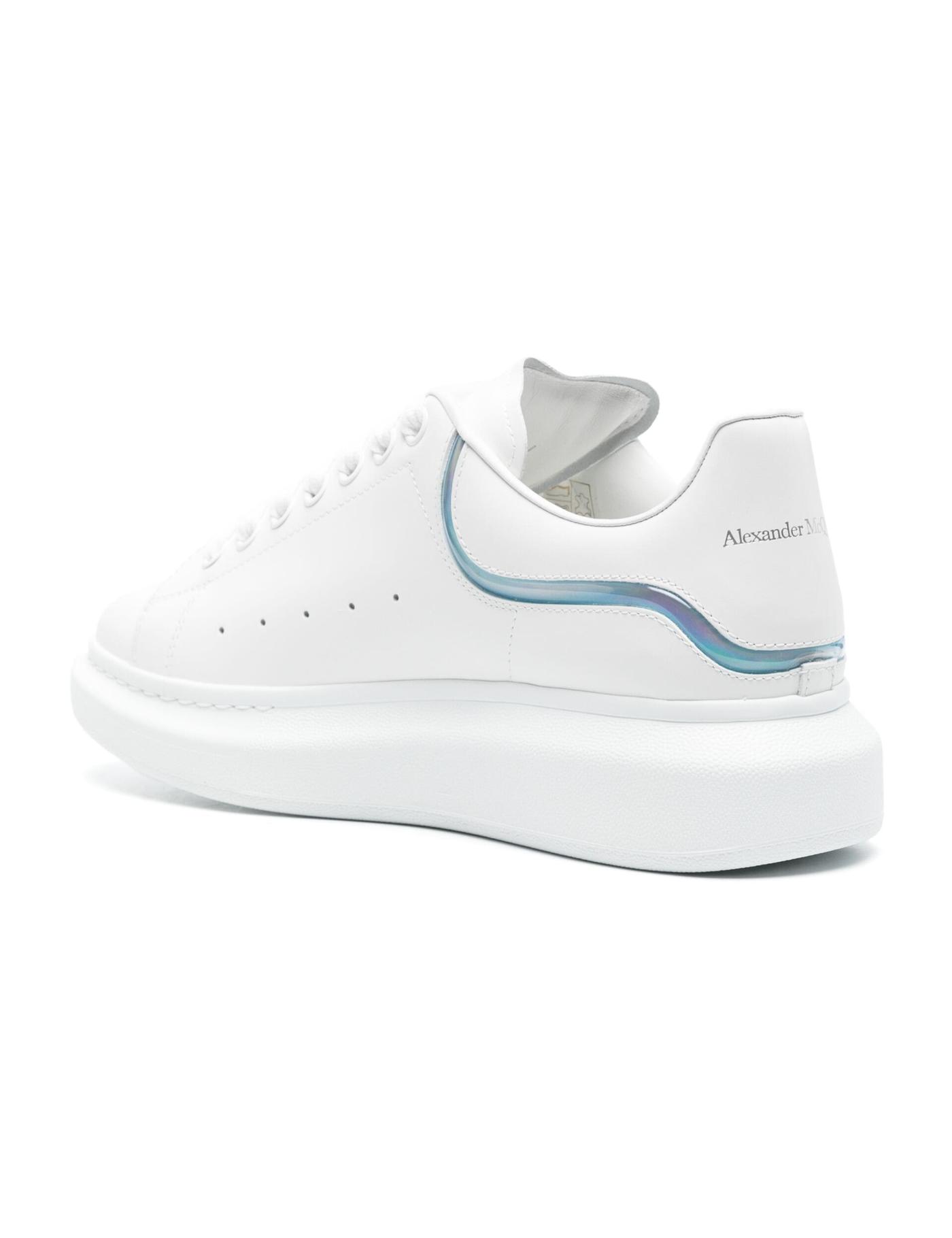 Alexander McQueen's Oversized sneaker family is distinguished by its branded heel counter and namesake rubber soles. This pair is crafted from white leather with a wavy iridescent insert that wraps around the collar.