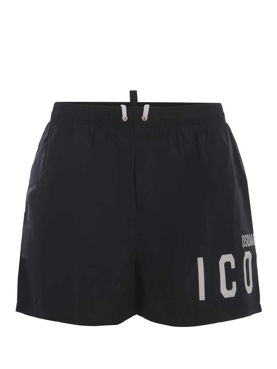 Swimsuit Dsquared2 made of Black nylon. Elastic waist with drawstring. Side pockets. Contrasting White "Dsquared2 Icon" lettering logo on the side. Internal slip.