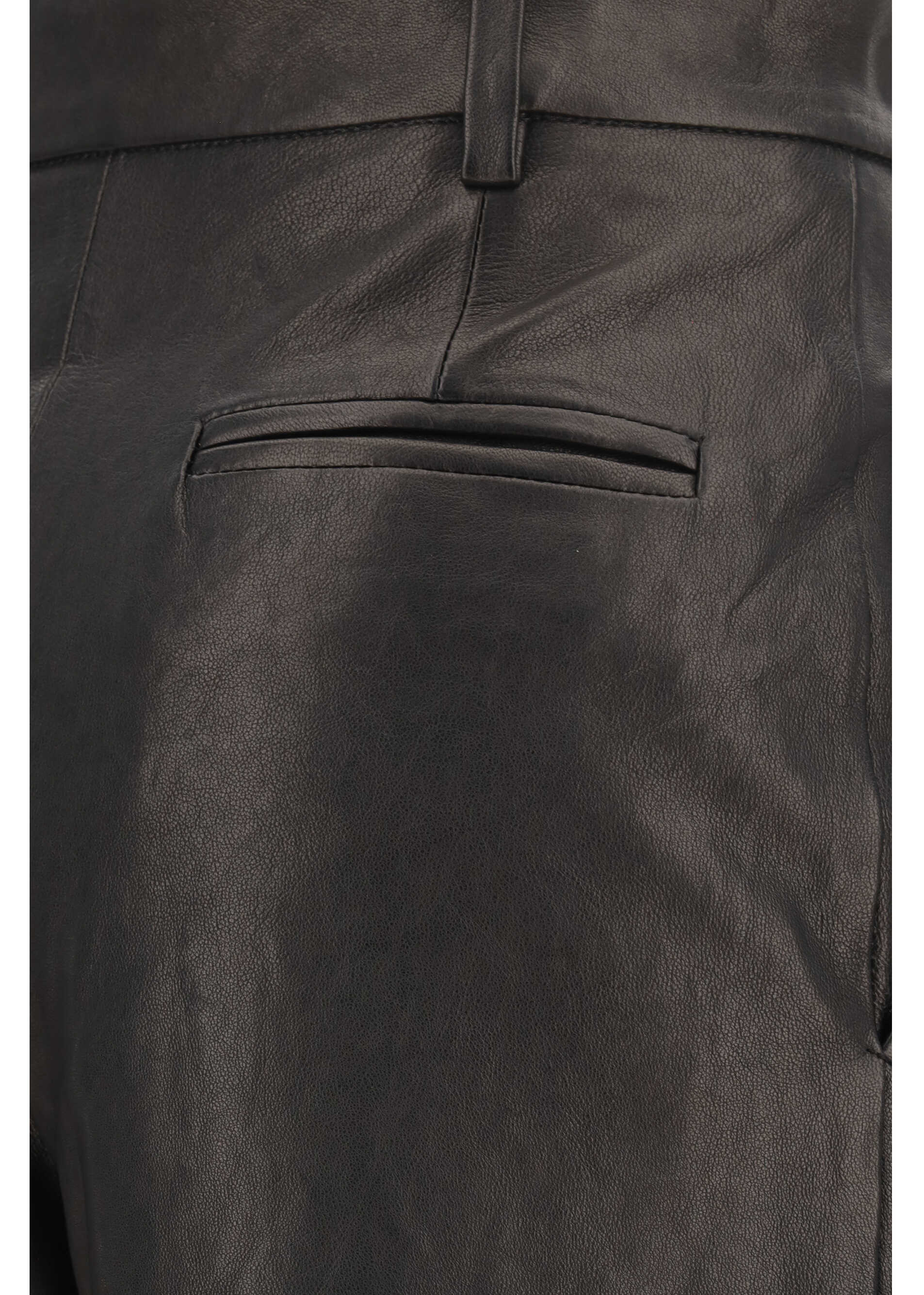 Leather Caiton Pants by Khaite, wide-leg style, zipper and button front closure, paneled design, two side slash pockets, two welt patch pockets on side panels, two back slit pockets, belt loops waistband, regular fit.