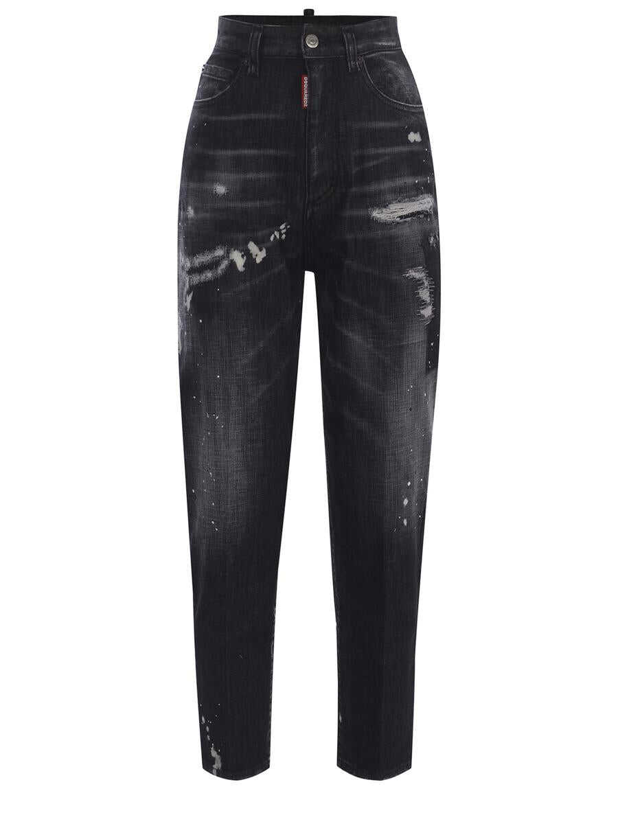 Jeans Dsquared2 "80'S" made of Black denim. Stone wash effect. Breaks and patches. All-over contrast paint splashes. High waist. Five pockets. Button and zip closure. Contrasting logo patch applied on the front. Logo label applied on the back.