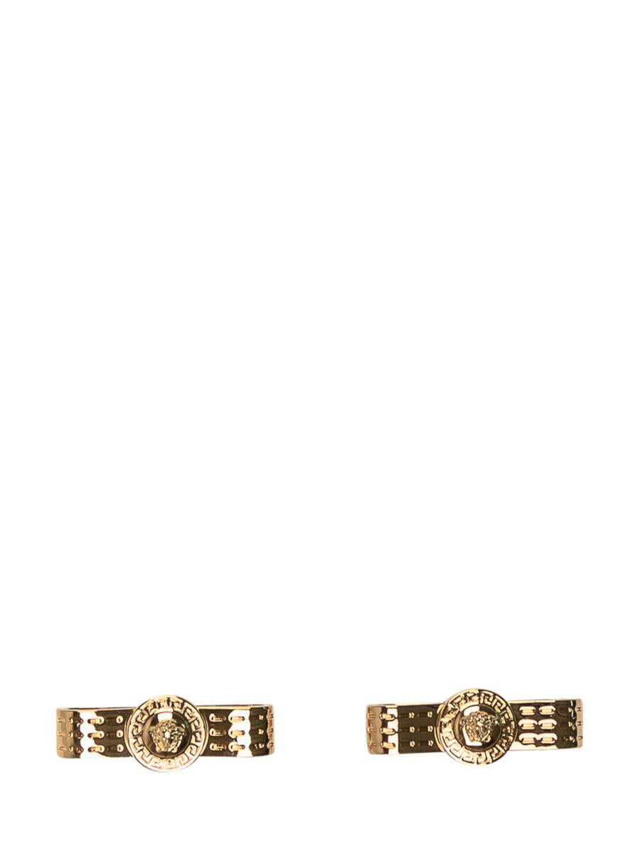 Gold-colored earrings. Versace logo. Butterfly closure.
