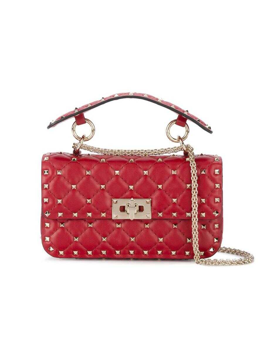 Combining vintage style with a rocker edge, is the Rockstud Spike crossbody bag by Valentino. Staying true to the designer's affinity with luxurious design, this bag is crafted in red leather for Spring Summer 2018 and is sprinkled with Valentino’s signature Rockstuds. Finished with a delicate top handle, quilting and a foldover top with flip-lock closure, this coveted accessory will easily find a place alongside an evening ensemble. WIDTH: 18.0 Centimetres