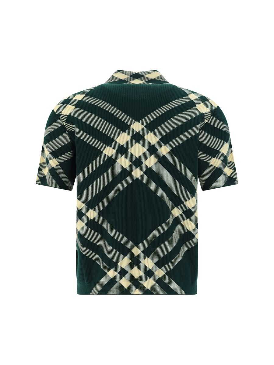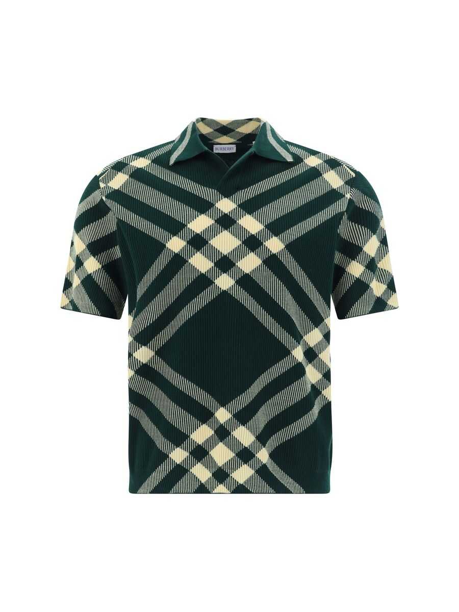 Burberry's polo shirt crafted in green wool blend ribbed-knit with contrasting Check pattern. It features polo collar, short sleeves and straight hem.