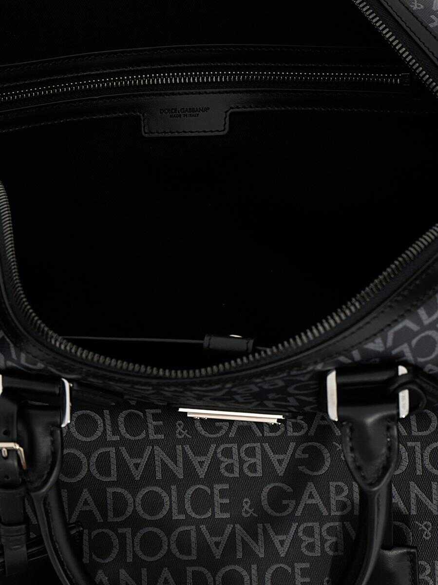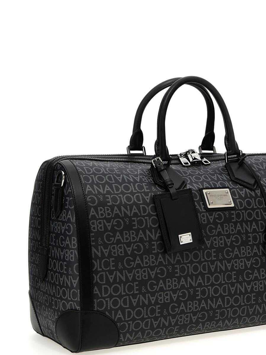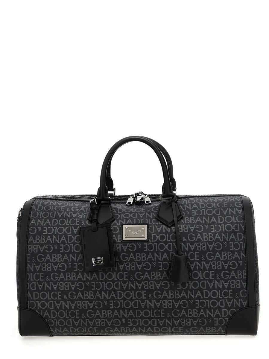 Duffel bag in coated jacquard fabric with leather details, zip closure, double handle, adjustable and removable shoulder strap