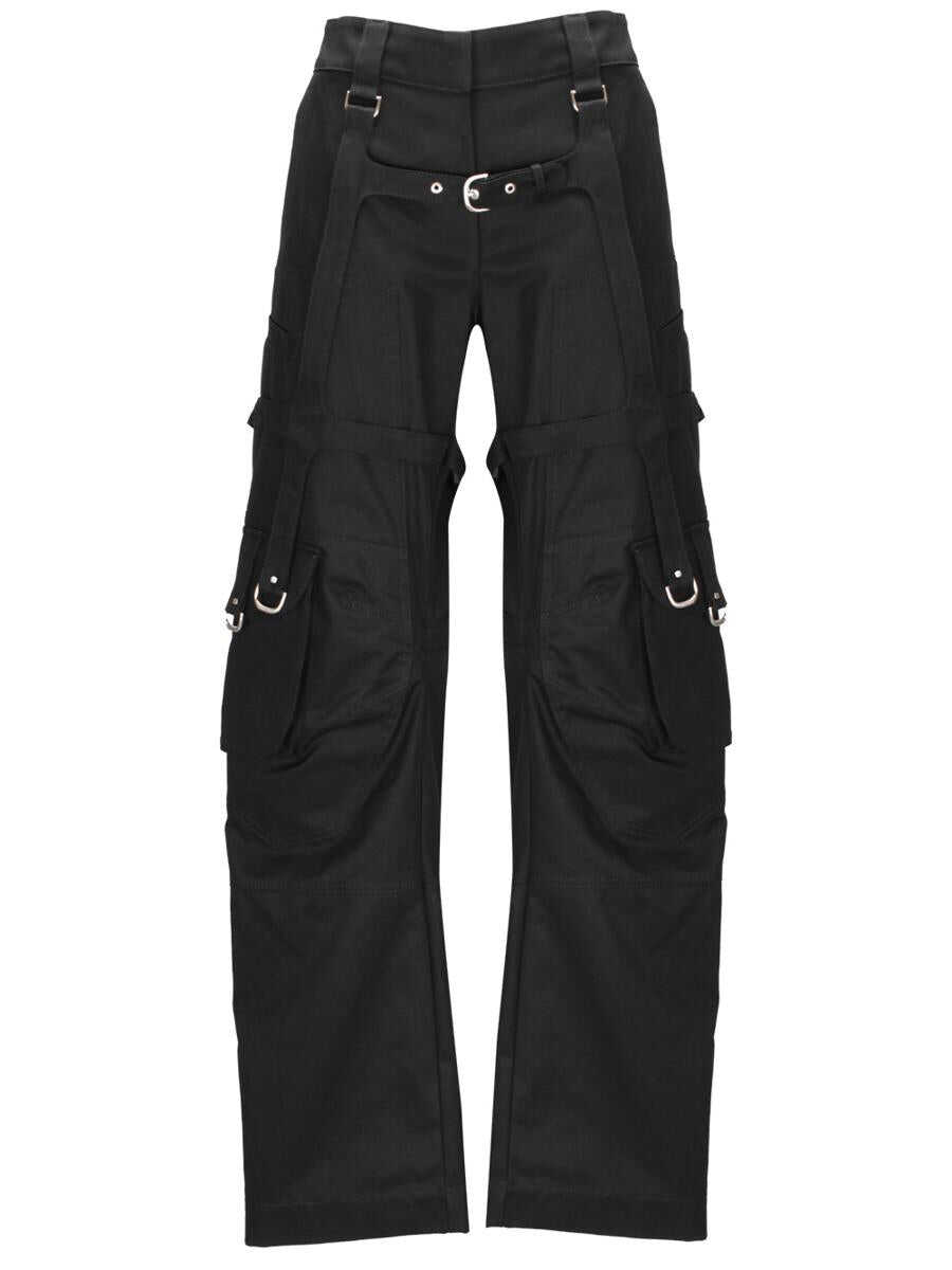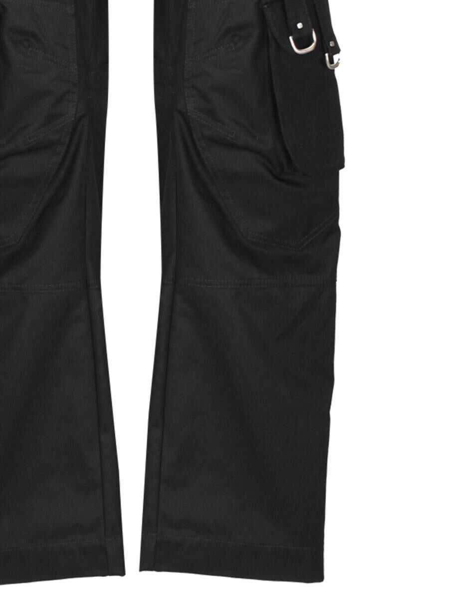 black cotton twill weave dart detailing silver-tone hardware D-ring findings belt loops low-rise straight leg two side inset pockets rear welt pocket rear flap pocket multiple cargo pockets concealed front button, hook and zip fastening adjustable cargo belt unlined