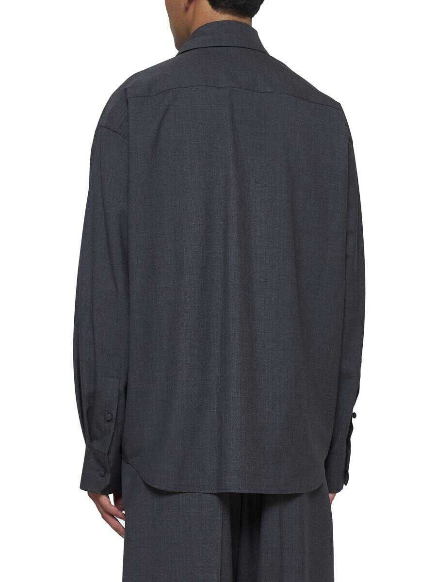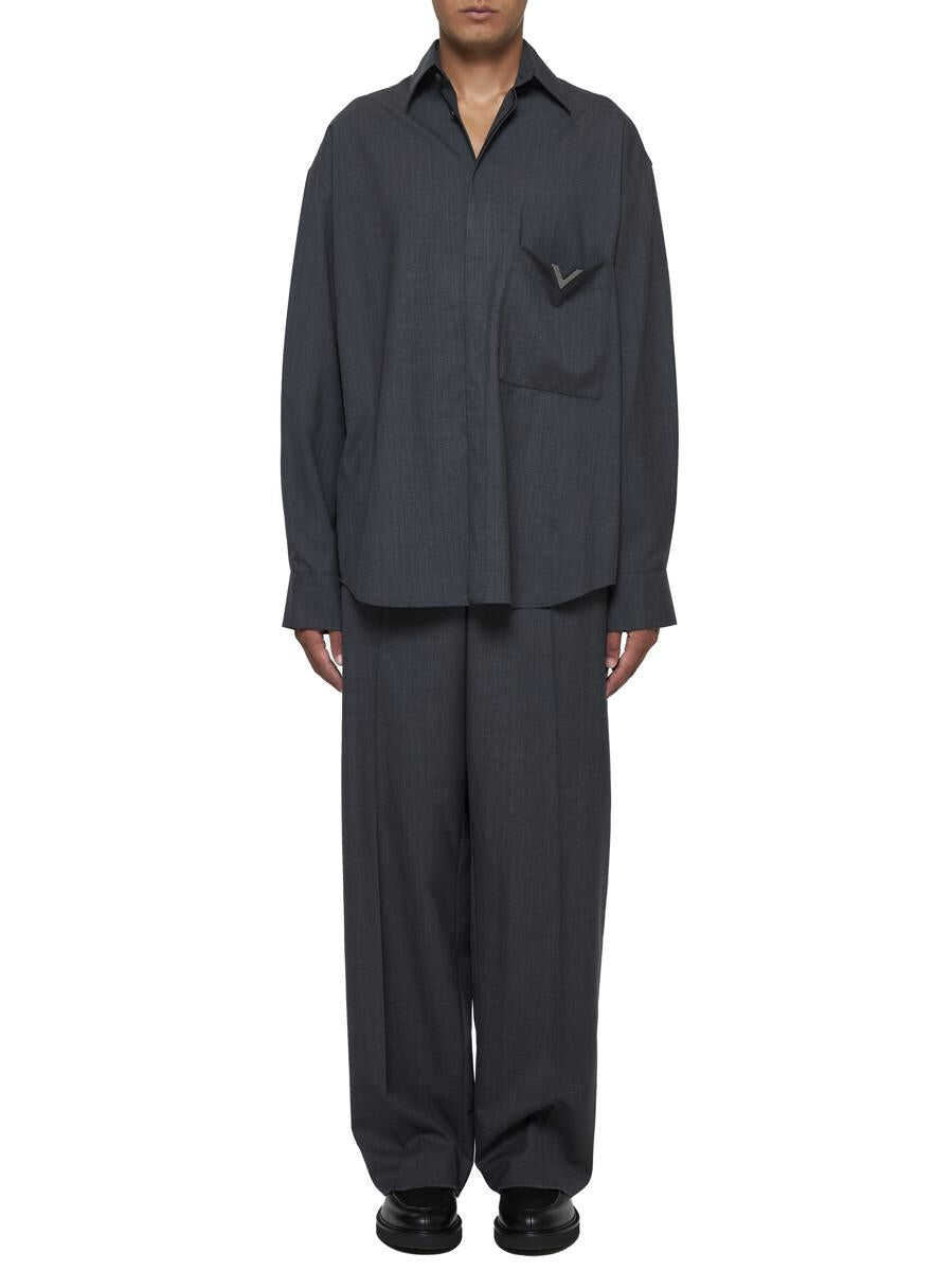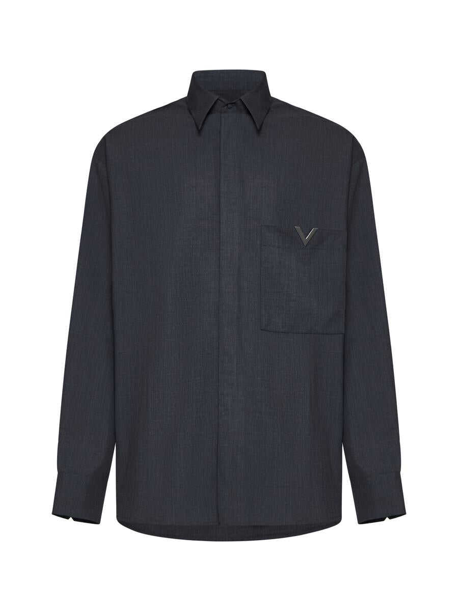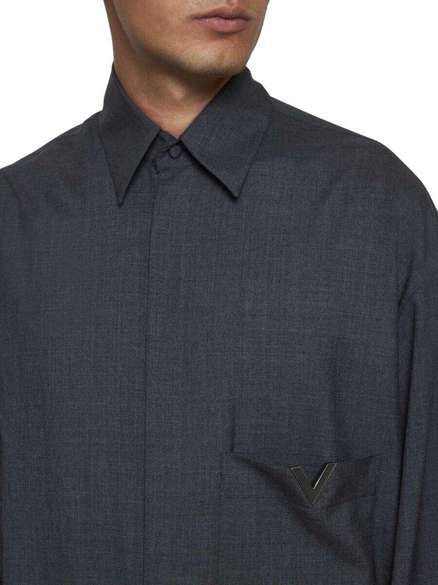 Valentino’s melange grey virgin wool shirt featuring a pointed collar, concealed front buttoning, chest pocket with VLogo plaque, dropped shoulders, buttoned cuffs and rounded hem. The model is wearing shoes and accessories from Valentino Garavani.