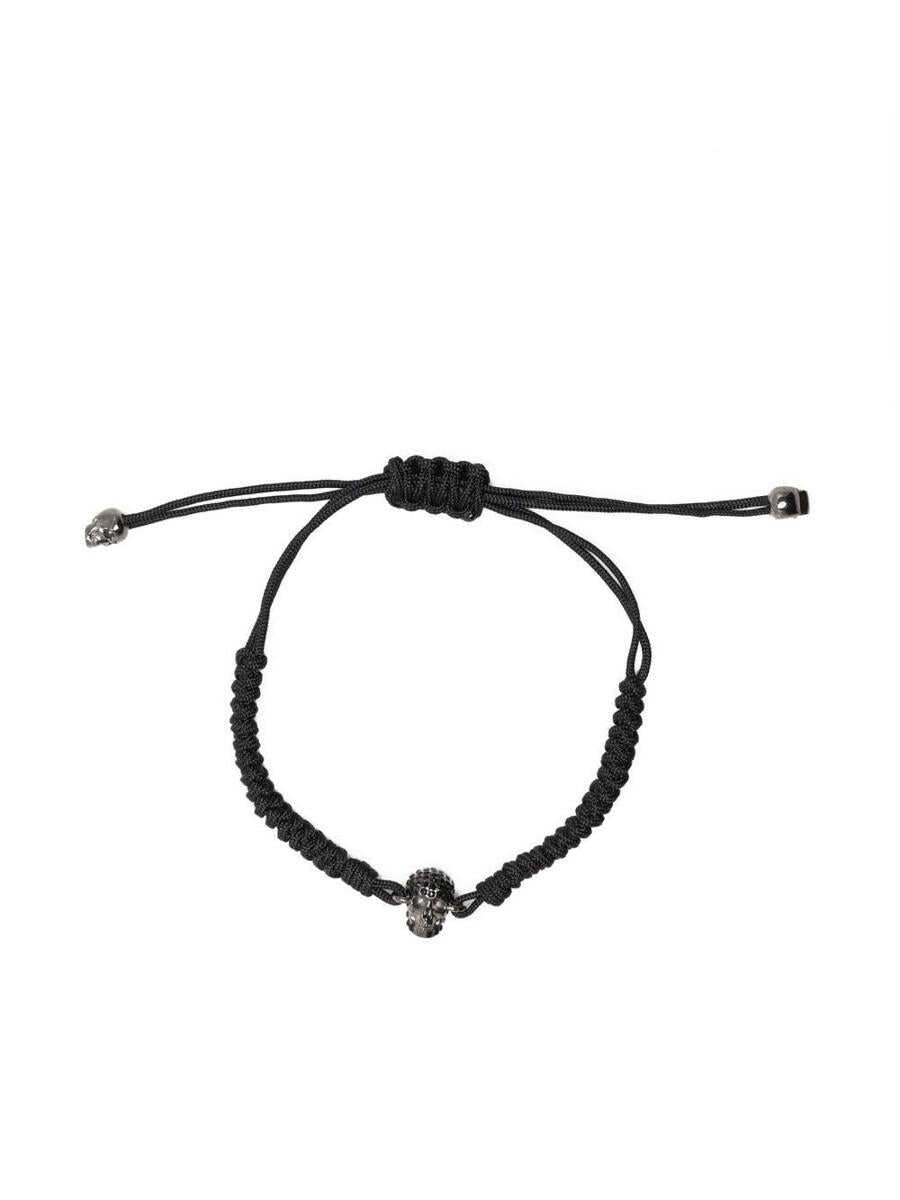 Pavé Skull Friendship bracelet from Alexander McQueen featuring black, Swarovski crystal embellishment, skull stud embellishment, sliding knot fastening and braided strap.