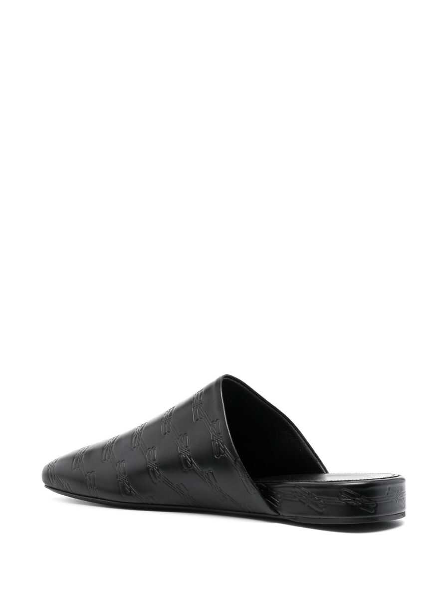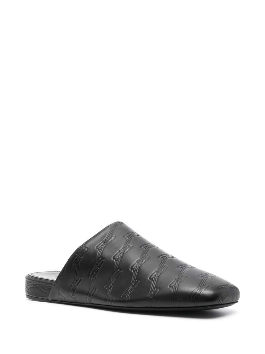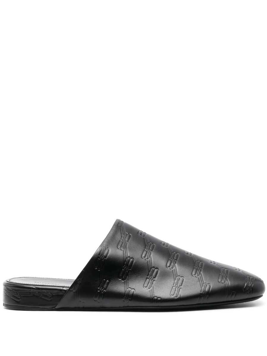debossed-logo leather mules from BALENCIAGA featuring black, calf leather, all-over debossed logo print, slip-on style, round toe and flat leather sole.