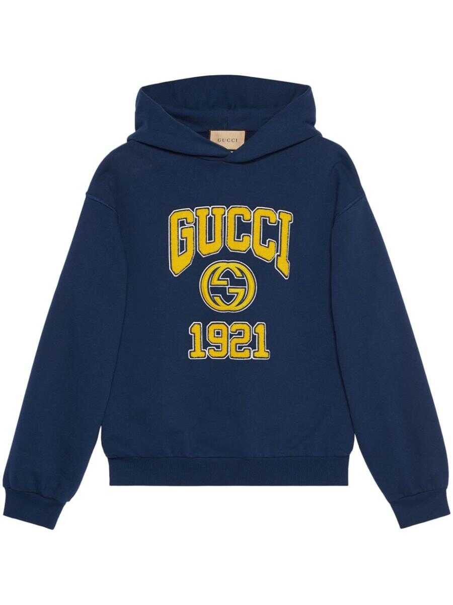 navy blue/yellow cotton jersey texture signature Interlocking G logo embroidered logo to the front classic hood drop shoulder long sleeves ribbed cuffs and hem This piece fits true to size. We recommend you get your regular size