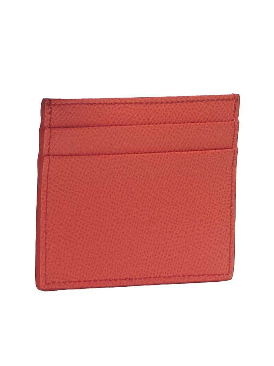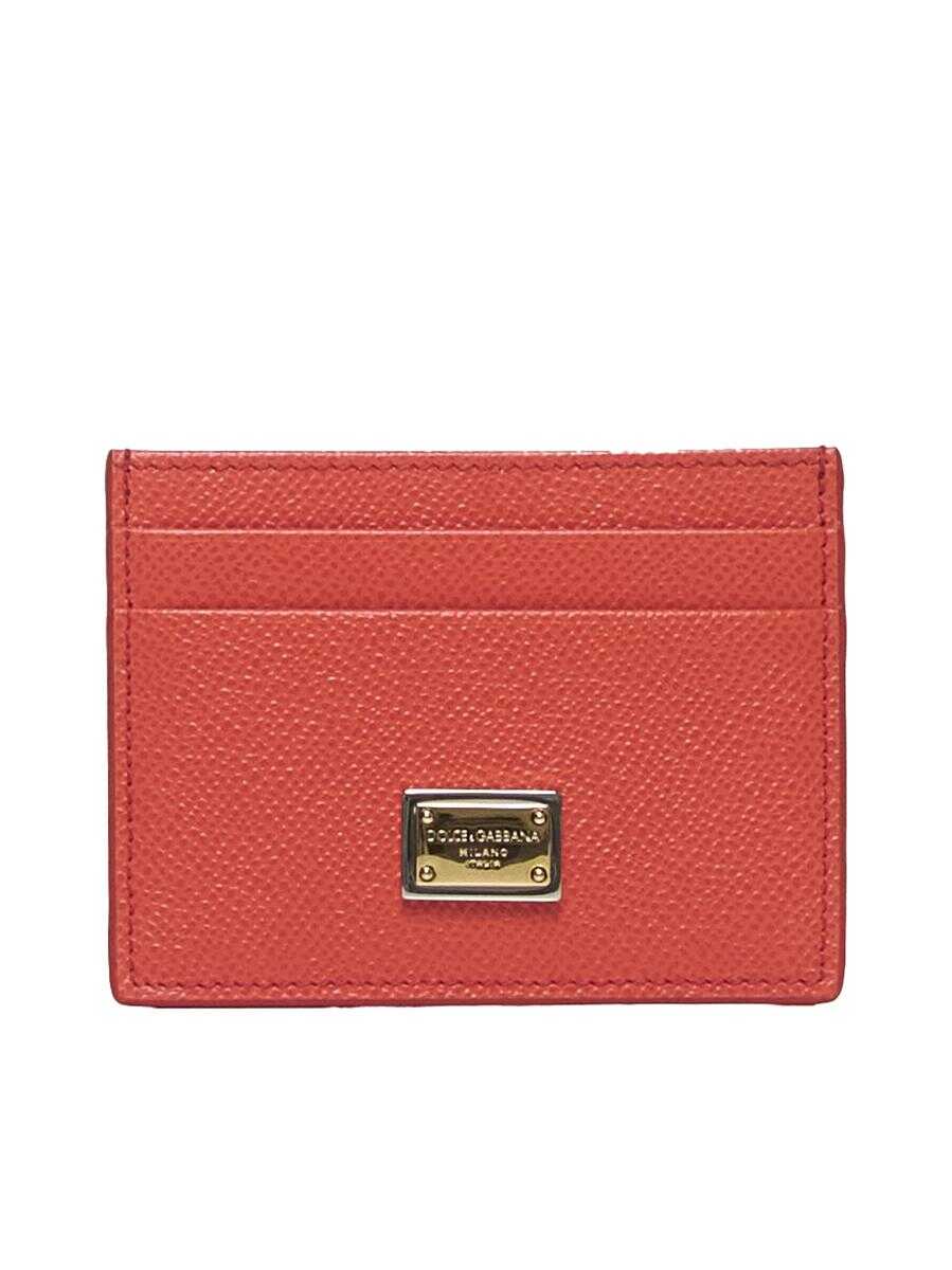 Dolce & Gabbana’s coral-tone Dauphine leather card holder featuring a gold and silver-tone metal logo plaque at the front, two slots on each side and central flat pocket.