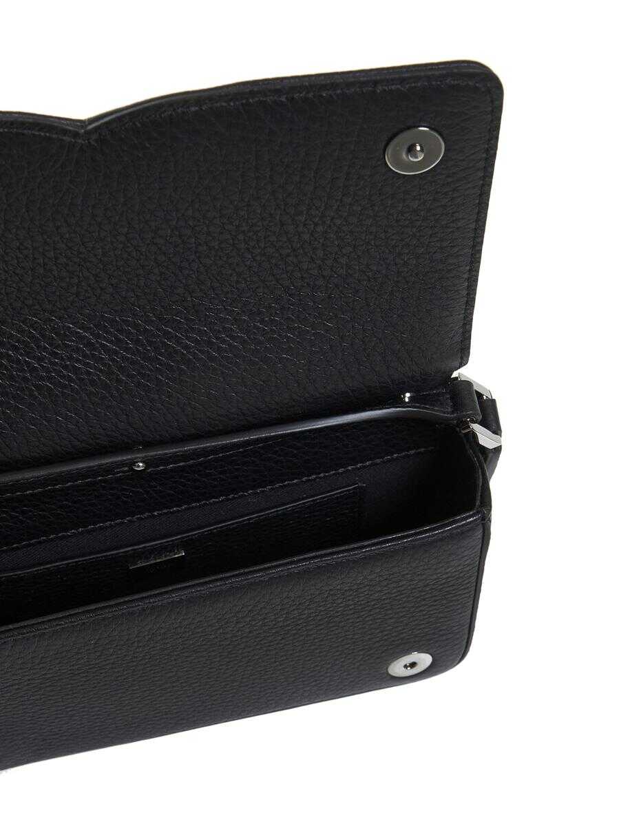 Dolce & Gabbana’s black leather mini bag featuring an adjustable shoulder strap, DG logo embossed on the flap, concealed magnetic fastening, internal card slot and silver-tone metal hardware.