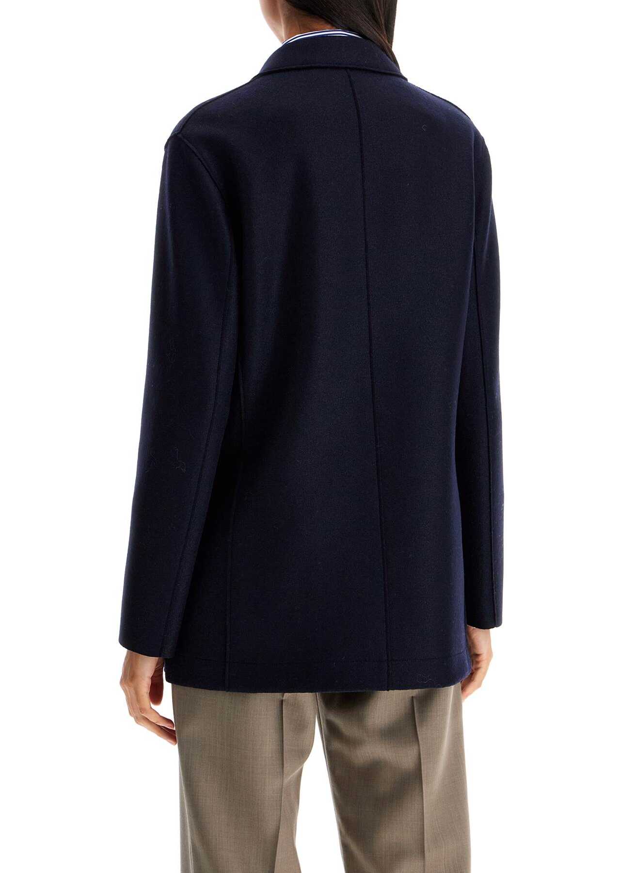 The Harris Wharf London double-breasted Caban is made of pure pressed virgin wool, featuring a six-button design with a wide foldable collar. It has side pockets, is unlined and finished with raw-cut edges. Relaxed fit. The model is 177 cm tall and wears size IT 38.
