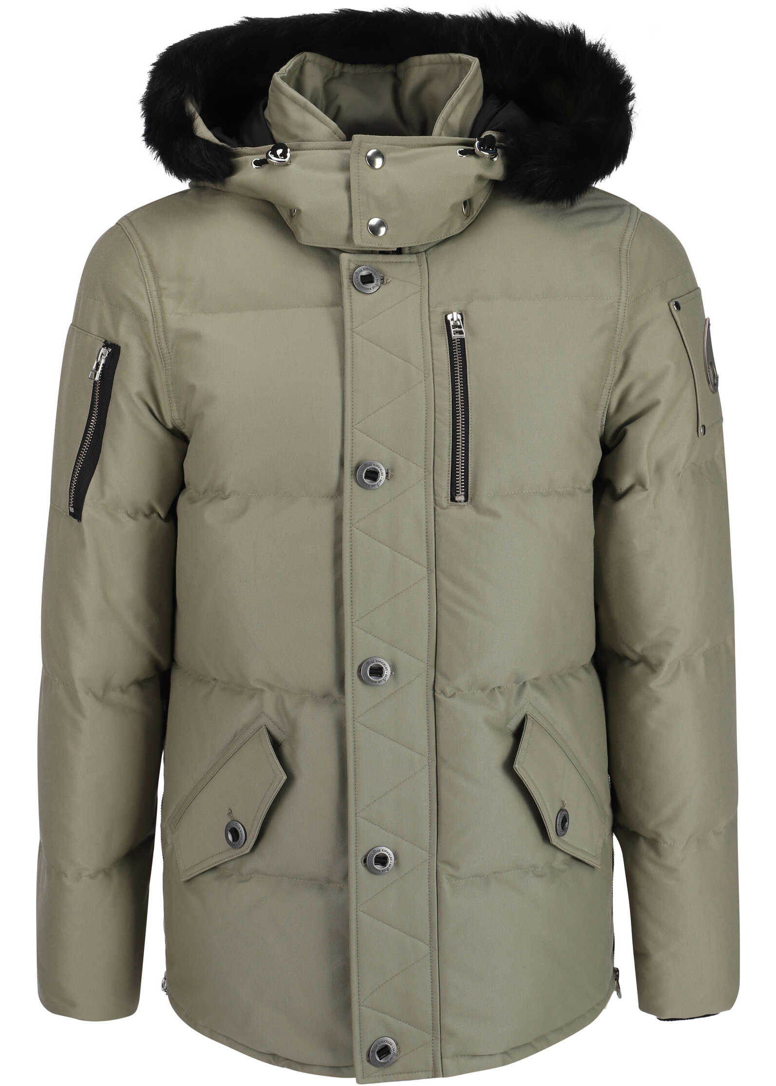 Cotton Neoshear Down Jacket by Moose Knuckles, design with removable buttoned hood and faux fur detail on perimeter, high collar, front zipper and buttoned flap closure, two side welt pockets with applied flap, vertical slit pocket with zipper on front, zippered patch pocket on right sleeve, all-over quilted and padded design, elastic ribbed cuffs, adjustable zippered side slits, iconic brand logo metal plaque applied on left arm, regular fit.