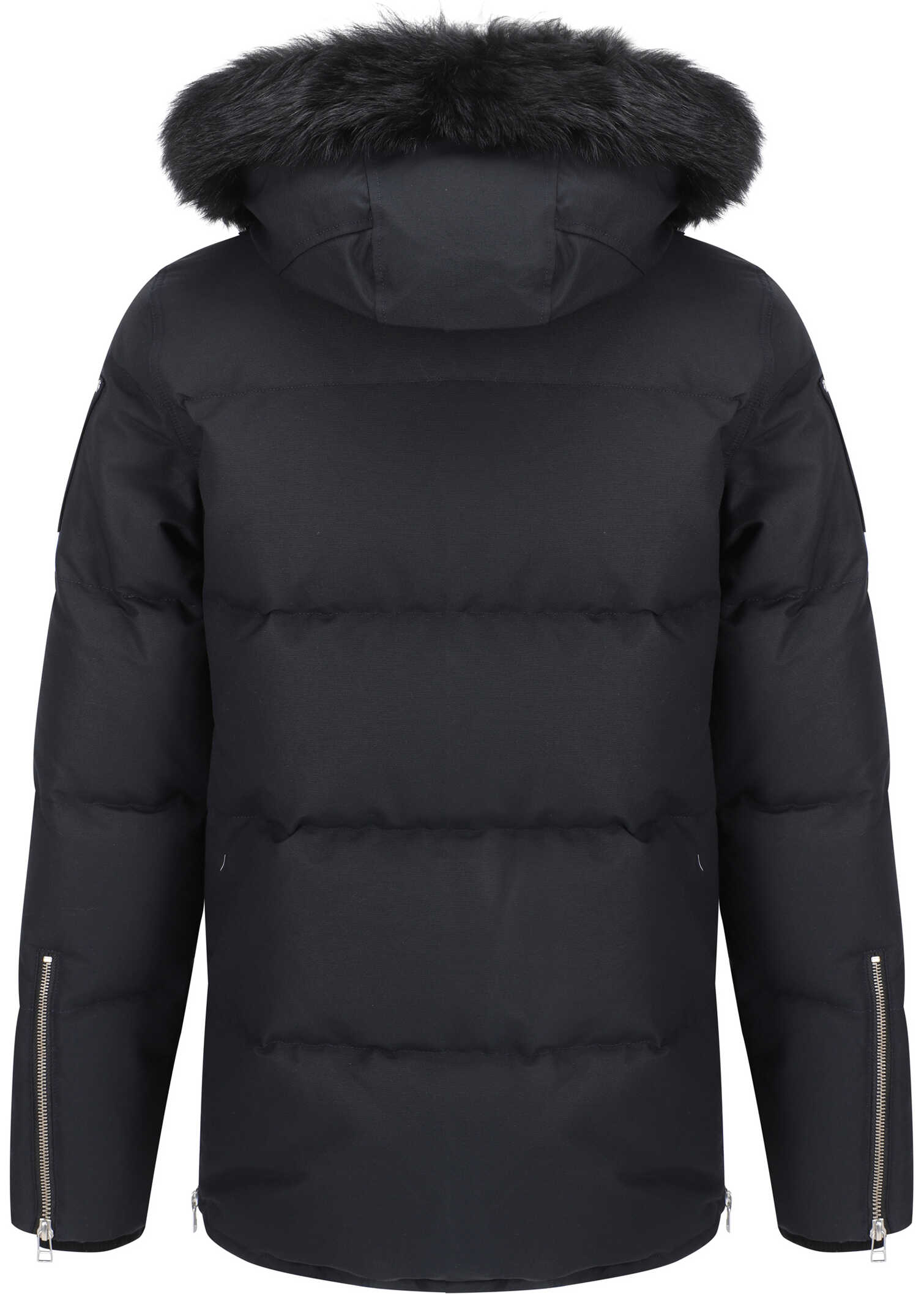 Cotton Neoshear Down Jacket by Moose Knuckles, design with removable buttoned hood and faux fur detail on perimeter, high collar, front zipper and buttoned flap closure, two side welt pockets with applied flap, vertical slit pocket with zipper on front, zippered patch pocket on right sleeve, all-over quilted and padded design, elastic ribbed cuffs, adjustable zippered side slits, iconic brand logo metal plaque applied on left arm, regular fit.