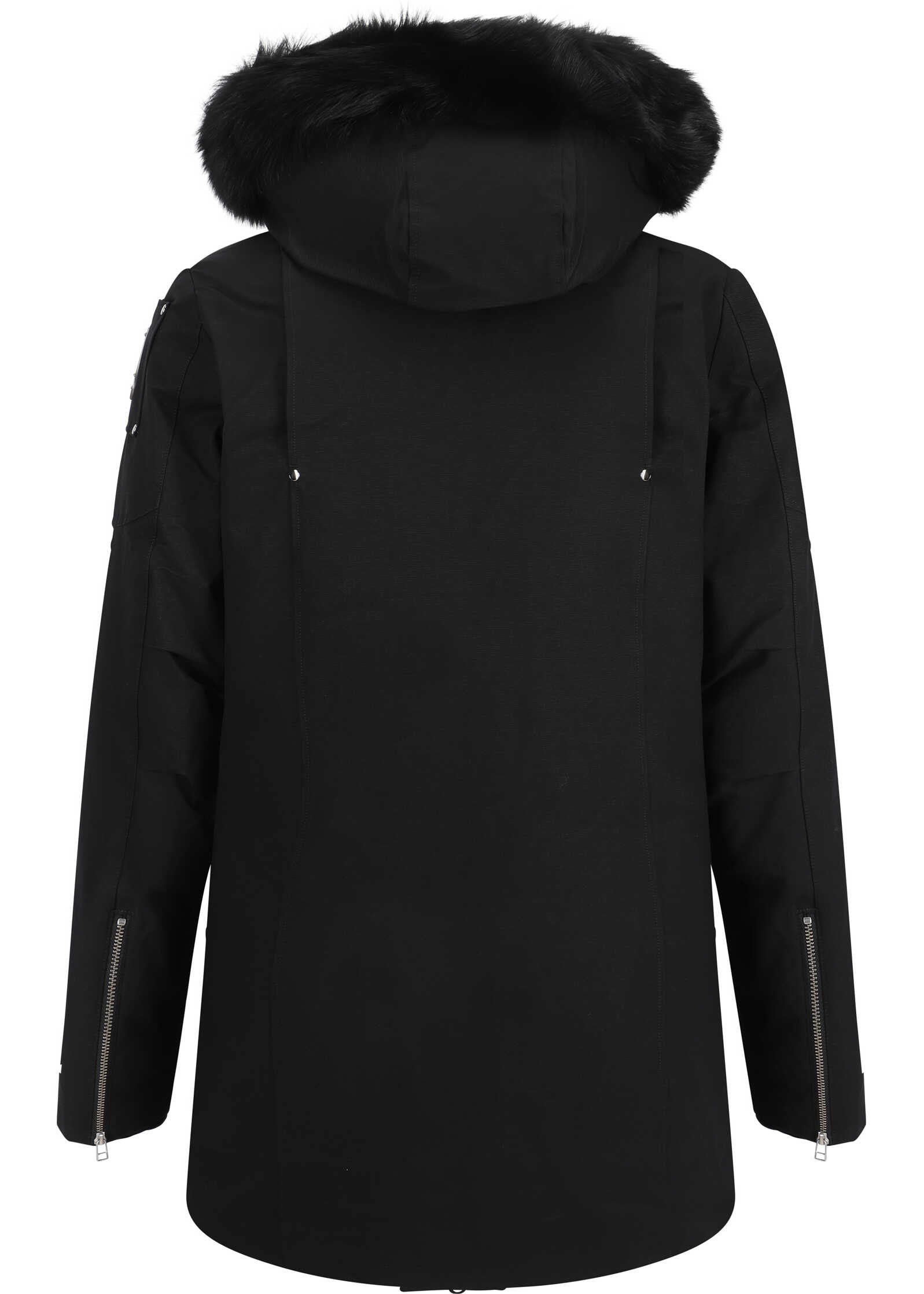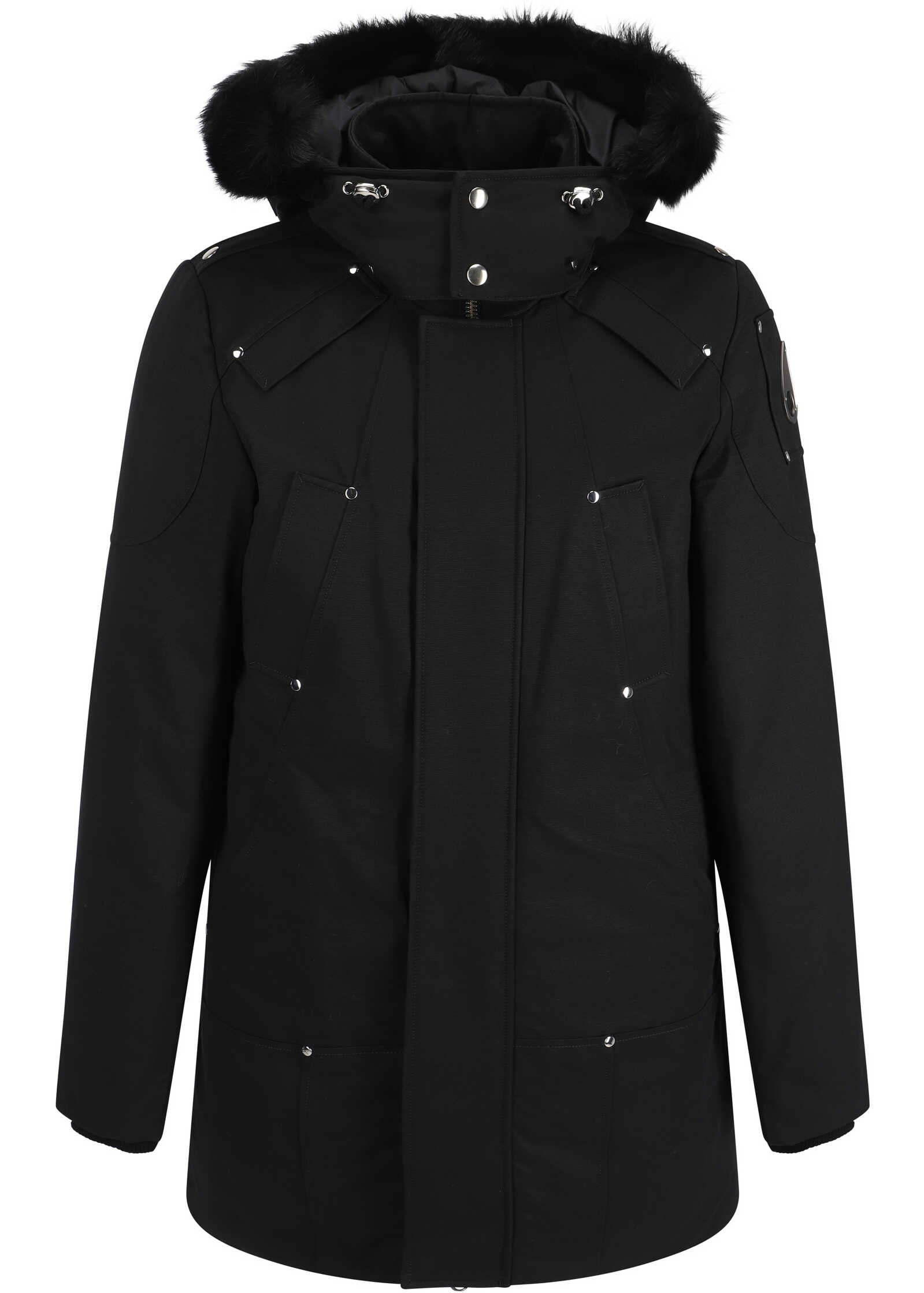 Cotton Original Stirling Parka Jacket by Moose Knuckles features a button-removable hood and faux fur detail on the perimeter, a high collar, a double-slider front zipper and button flap closure, four welt pockets on the front, an all-over quilted and padded design, elastic ribbed cuffs, an applique brand iconic metal logo plaque on the left arm, and a regular fit.