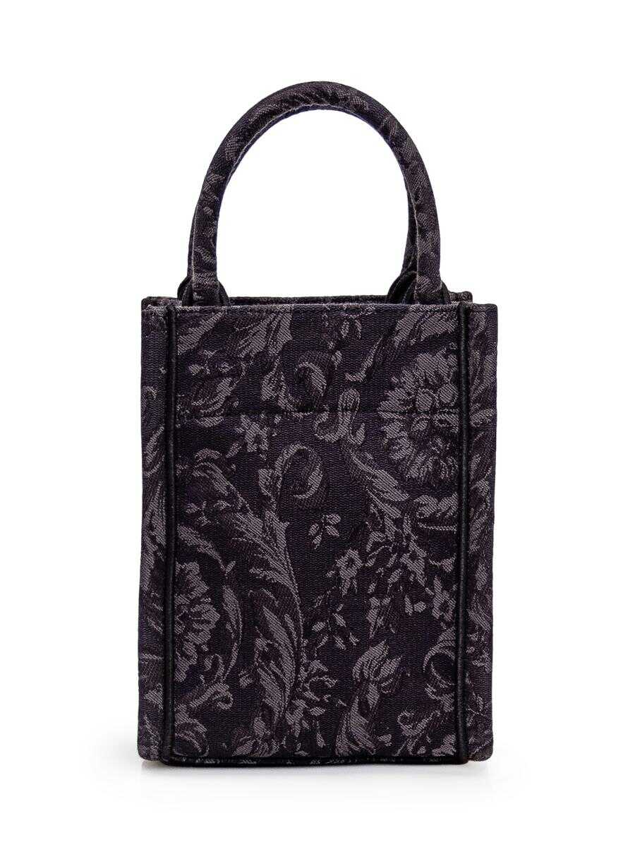 Black Baroque canvas mini tote bag with jacquard pattern. Two handles. Adjustable and removable shoulder strap. Logo with '90s Vintage embroidery on front. Width:17 Height:22 Depth:11