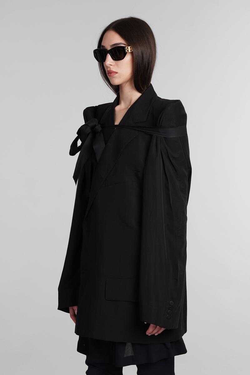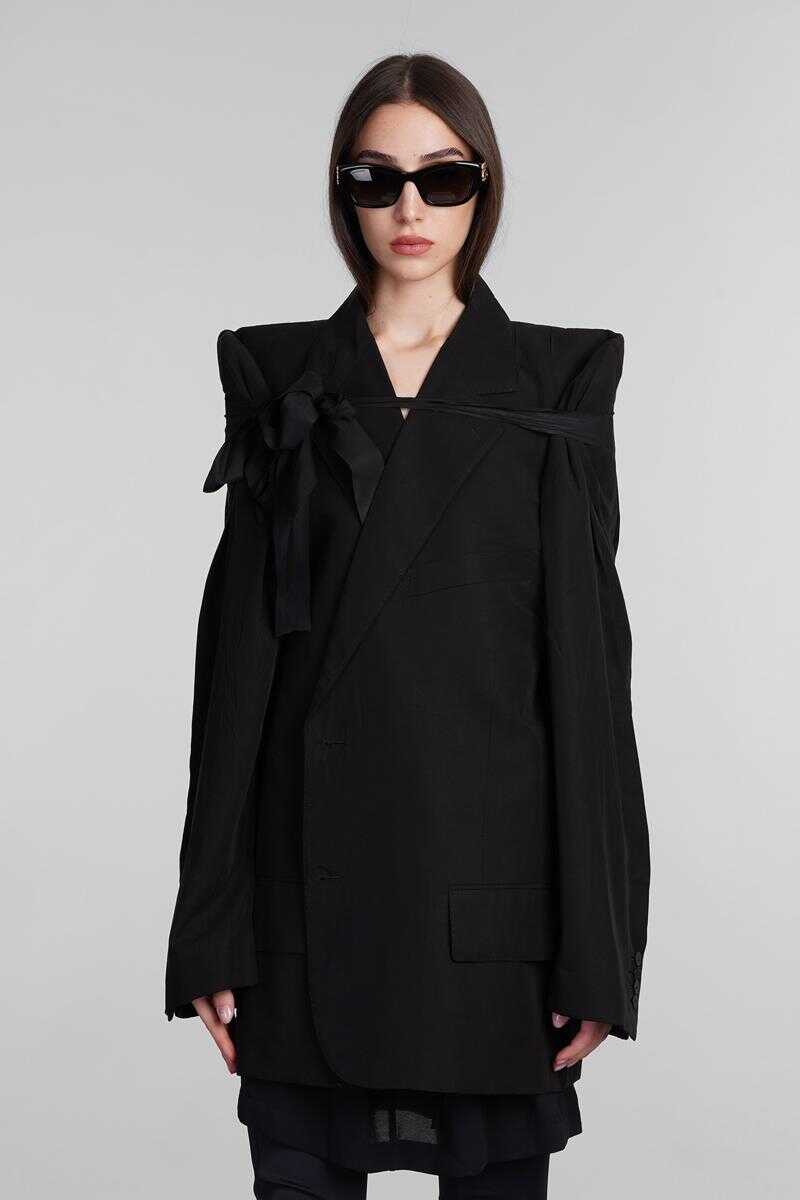 Blazer in black wool and polyester, two buttons closure, long sleeves, flap pockets, ribbon closure, back slip, buttons on the wrists, stitching detail, 100% lyocell, Made in Italy
