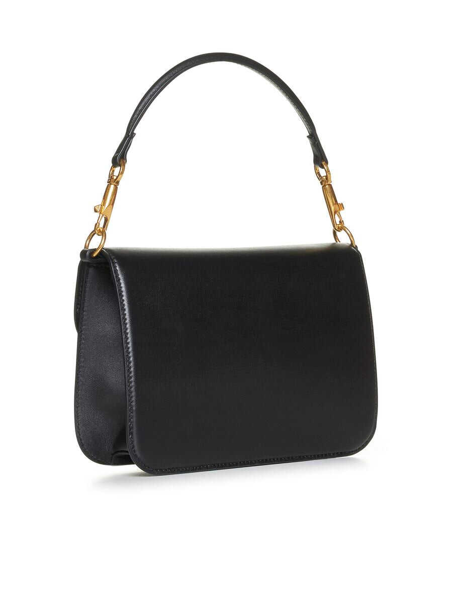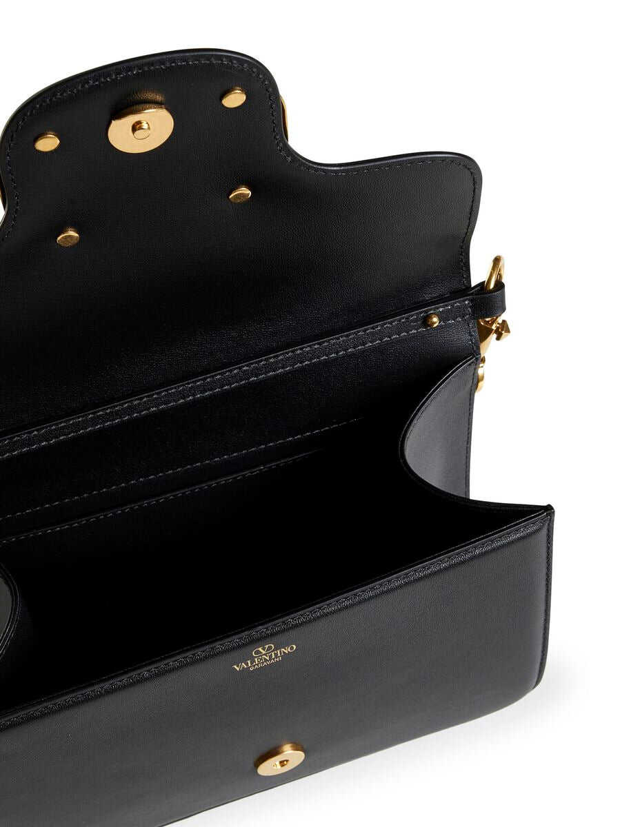 Valentino Garavani’s Loco' black leather shoulder bag featuring a detachable leather top handle, a detachable leather shoulder strap, tone-on-tone enameled VLogo Signature plaque on the flap, concealed magnetic fastening, internal flat pocket and gold-ton