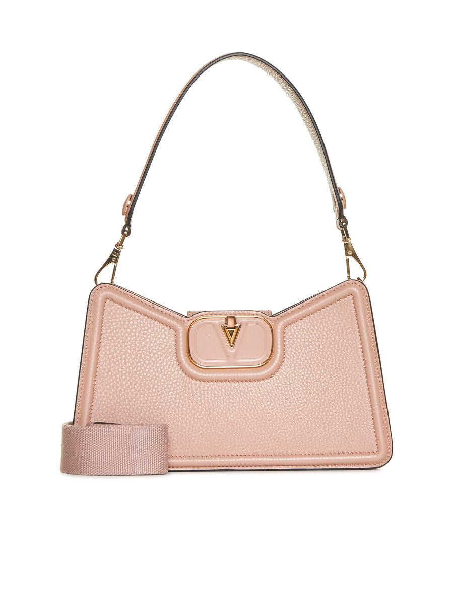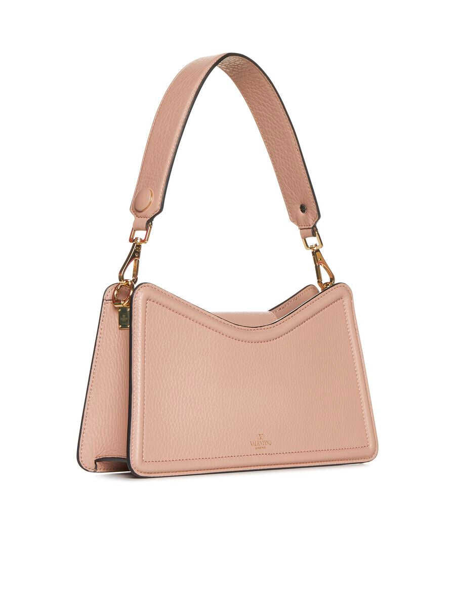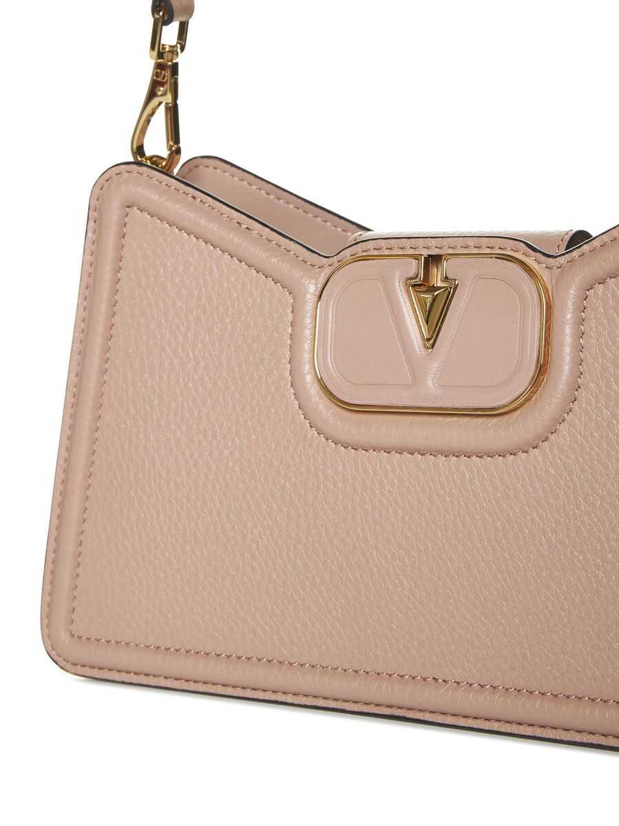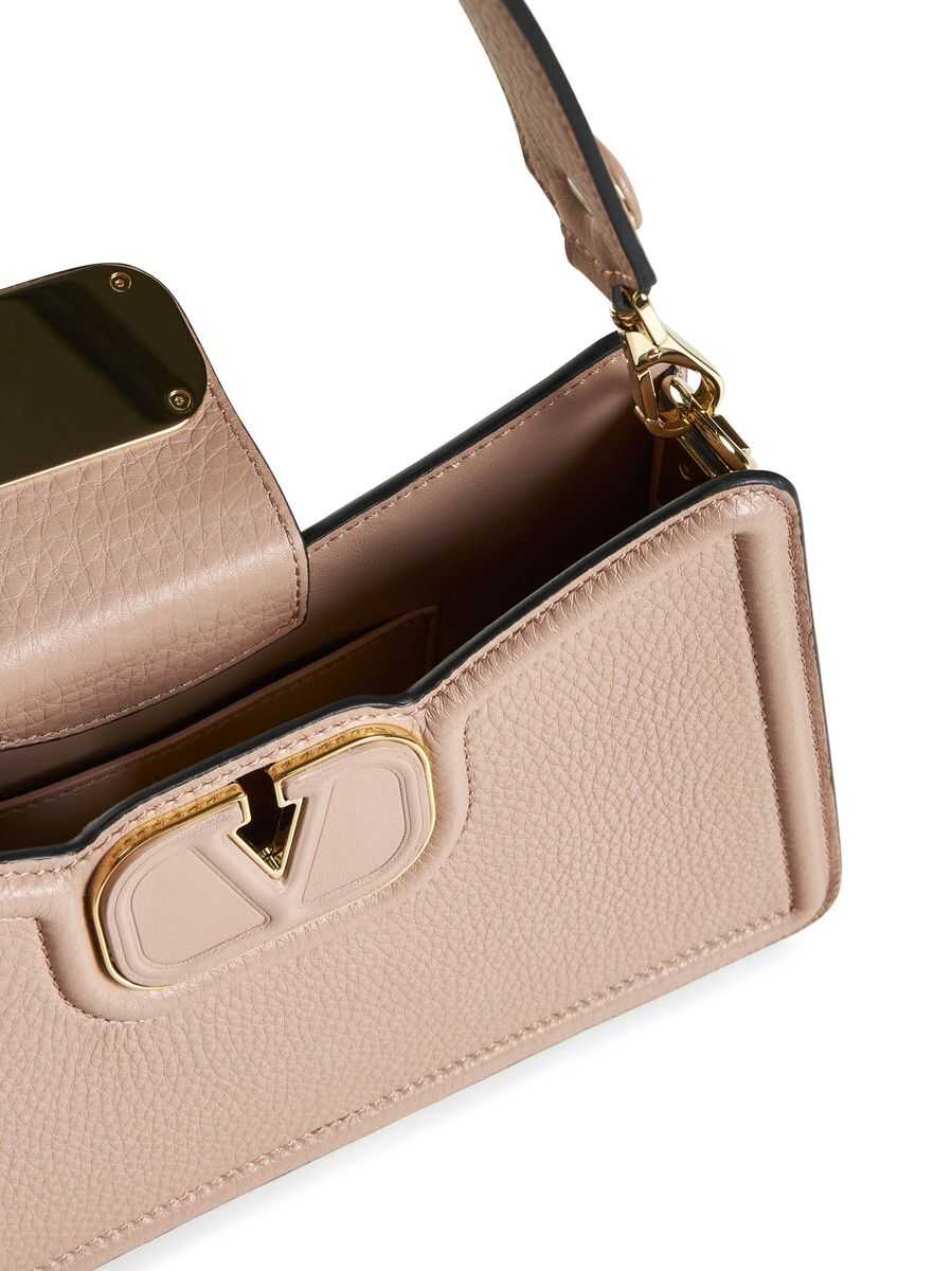 Valentino Garavani’s VLogo shoulder bag in pink grained leather featuring a detachable top handle, detachable fabric shoulder strap, VLogo Signature in metal and leather on the closure flap, internal card slot and gold-tone metal hardware.