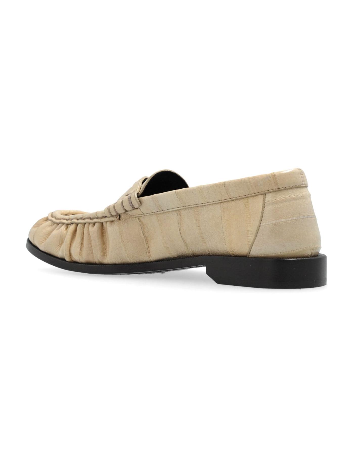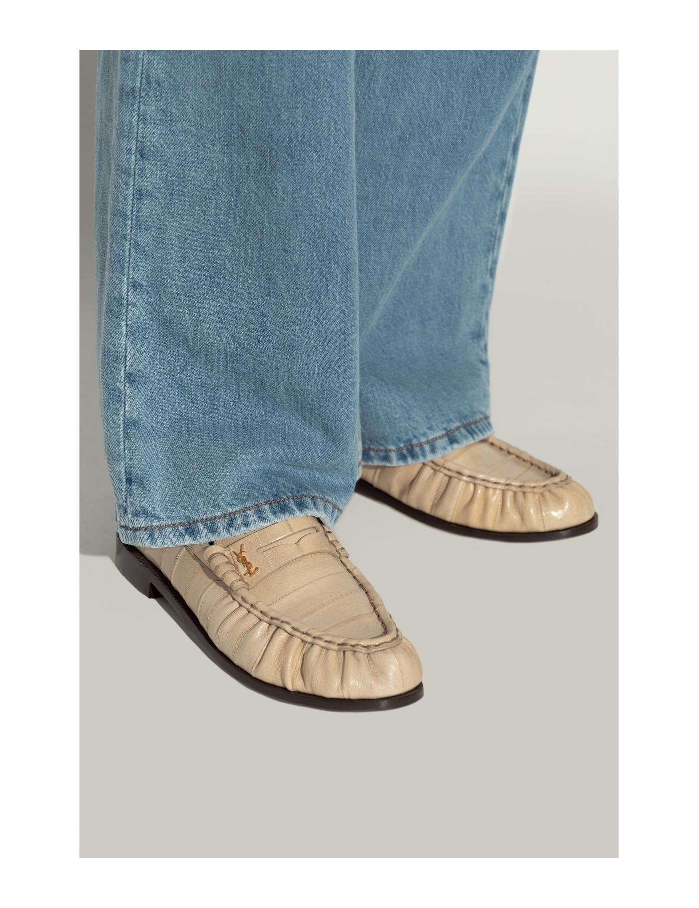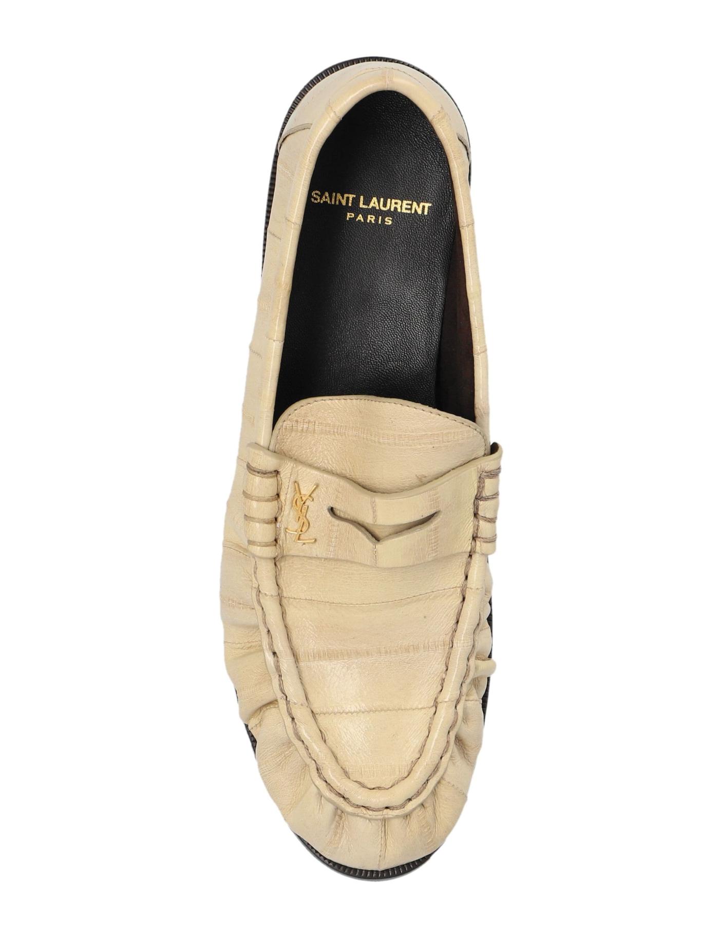 A testament to expert craftsmanship, Saint Laurent's Le Loafer shoes are made in Italy from light-beige leather to a classic penny style. They feature an apron toe traced by gathers, lending a tactile element, while the iconic Cassandre logo renders them unmistakable.