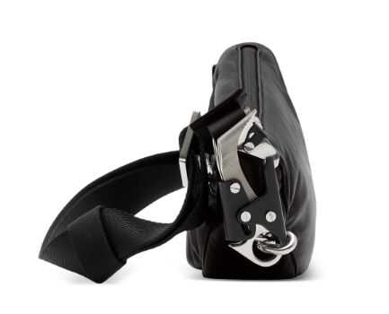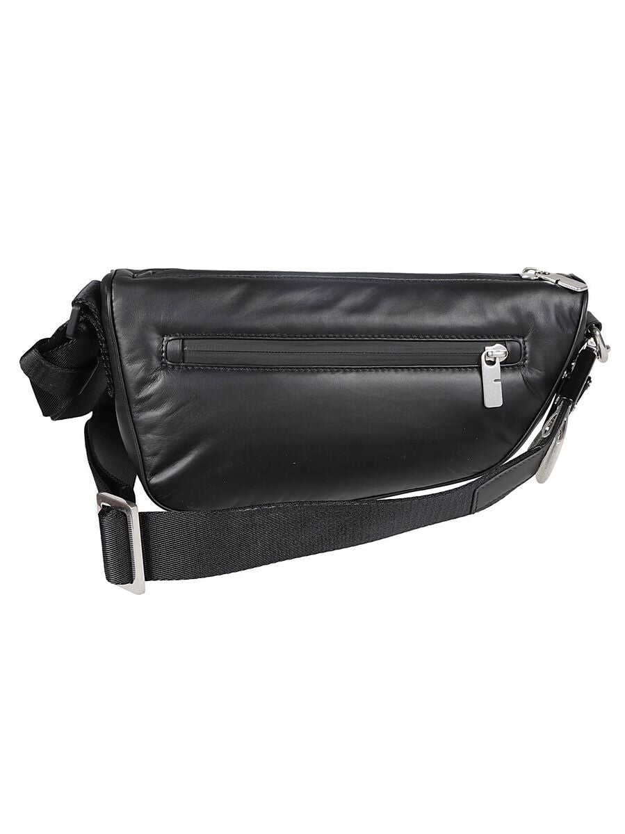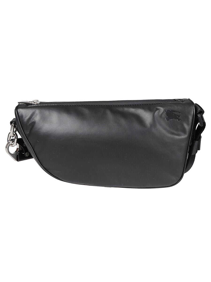 Shield zipped crossbody bag from BURBERRY featuring black, leather trim, asymmetric body, top zip fastening, rear zip-fastening pocket, adjustable shoulder strap and silver-tone hardware. DEPTH: 7.5 Centimetres HEIGHT: 15.0 Centimetres STRAP: 58.0 Centimetres WIDTH: 28.0 Centimetres