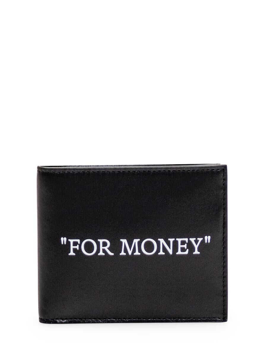 Black leather wallet. Compartments for credit cards and bills. ''FOR MONEY'' lettering inside and on front. Width: 11 Height: 9 Depth: 2.5